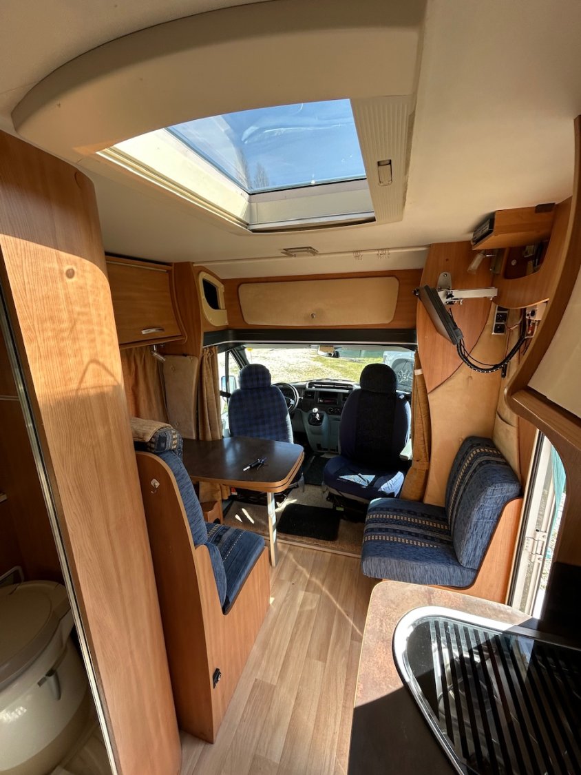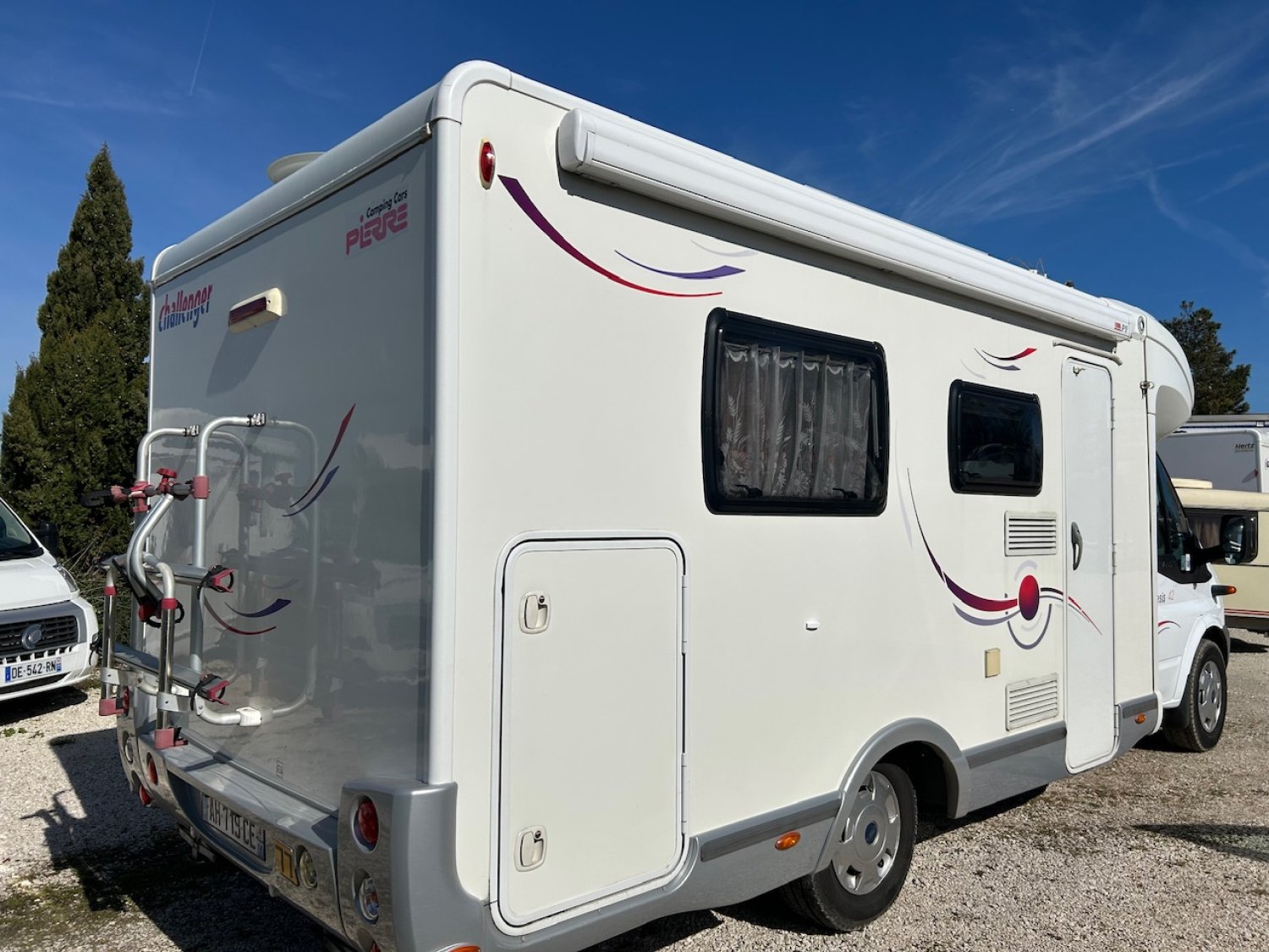 Panneau solaire, porte vélos, store extérieur, antenne sat manuelle, antenne hertzienne, tv, frigo tri mixte, chauffage diesel et chauffe eau gaz.
