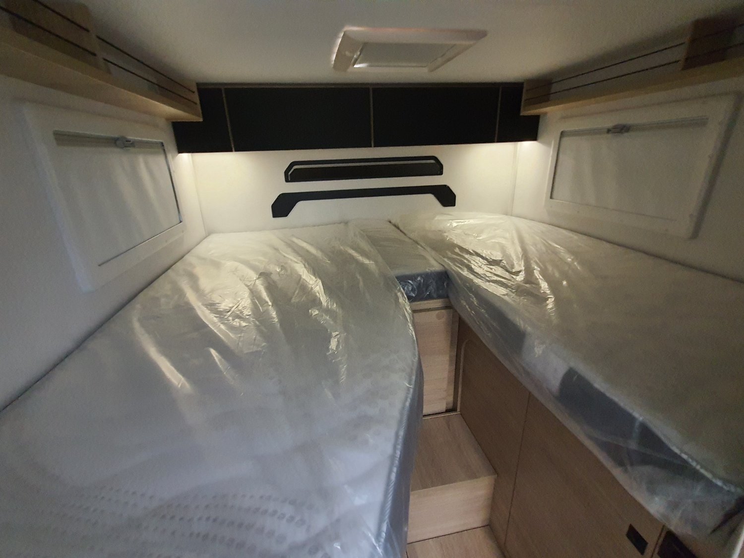 + Pack Accessoires S : Store extérieur - auvent, panneau solaire 140W,moustiquaire de porte, stores intérieur cabine, complément couchage dinette, compléments couchage lits jumeaux*, kit pose 2ème batterie (+3 000 €) (+55 kg)