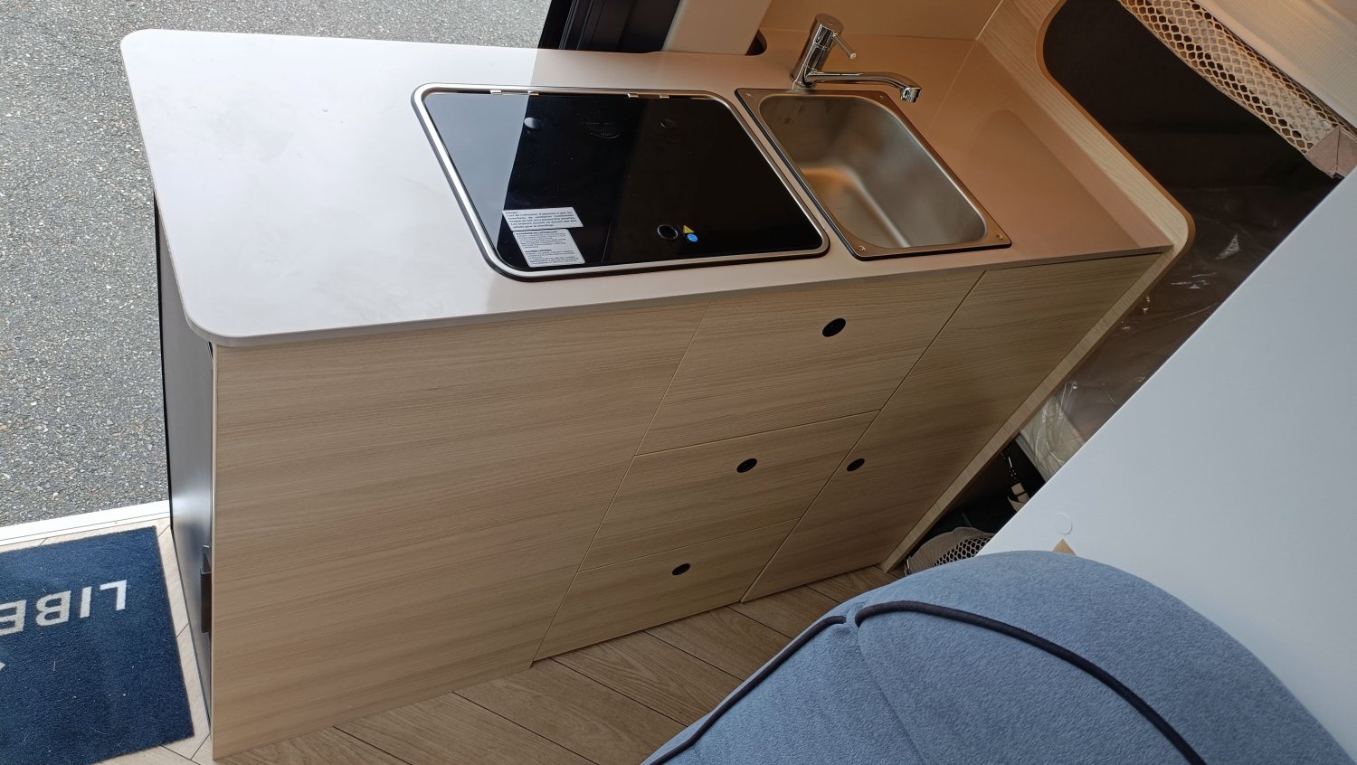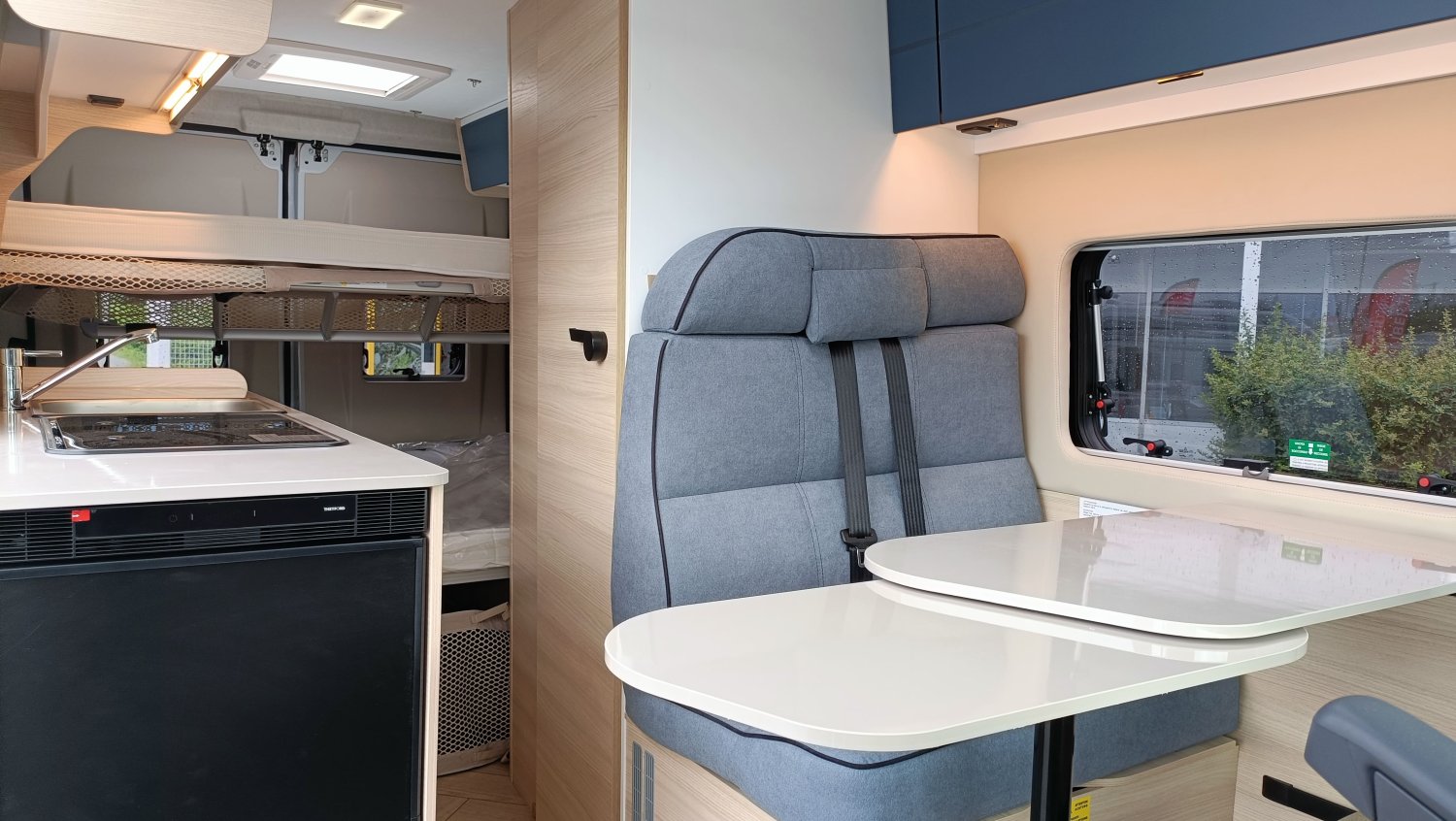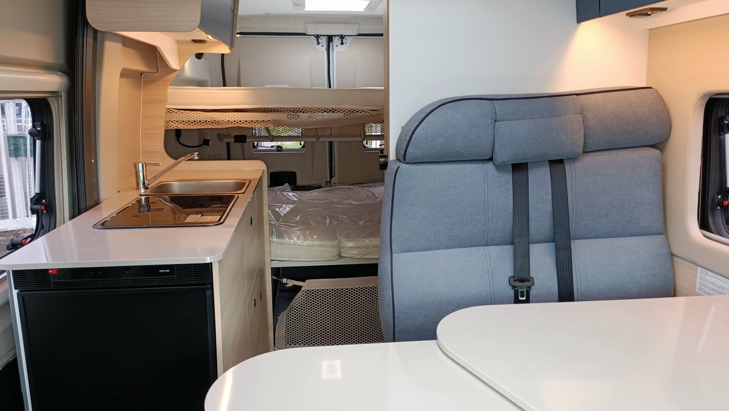 Fourgon de 5m99 aménagé avec le nouveau porteur Citroën Jumper en 140 CV. Le V 114 M dispose de 5 couchages dont 2 grands lits superposés arrières et un couchage additionnel en dinette. Présenté ici en finition BREAK EDITION LIGHT, ce fourgon dispose de tout le confort nécessaire avec un grand salon, une cuisine latérale avec de grands rangement, une salle d'eau avec toilette et de nombreux équipements.