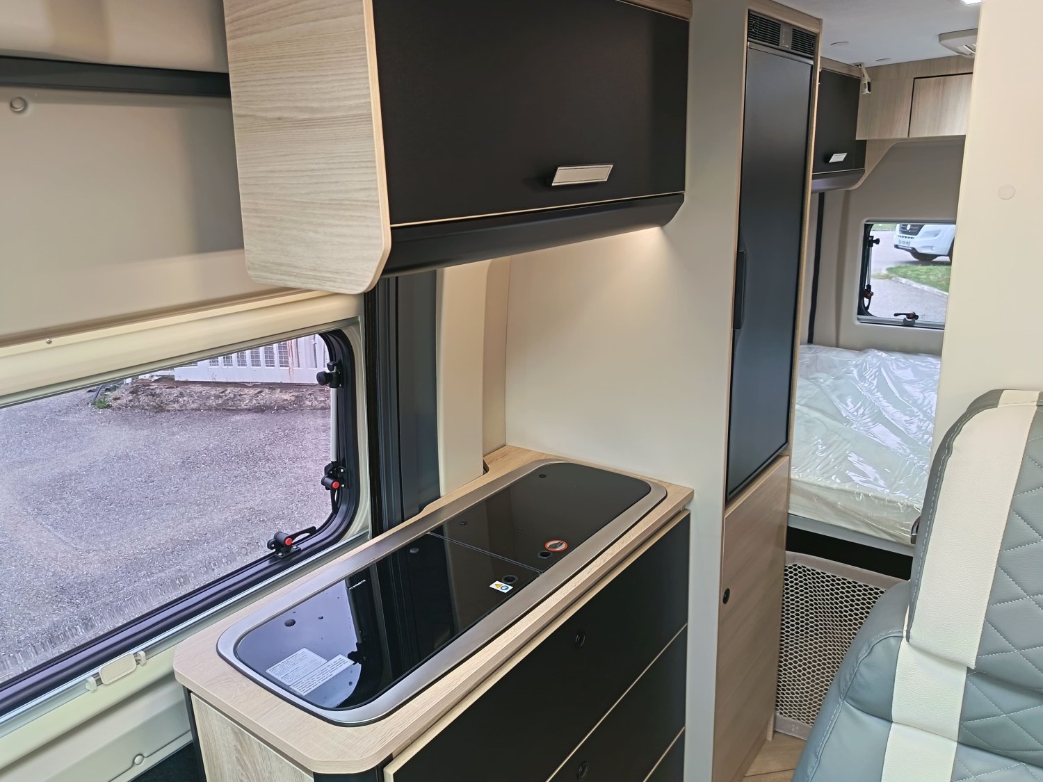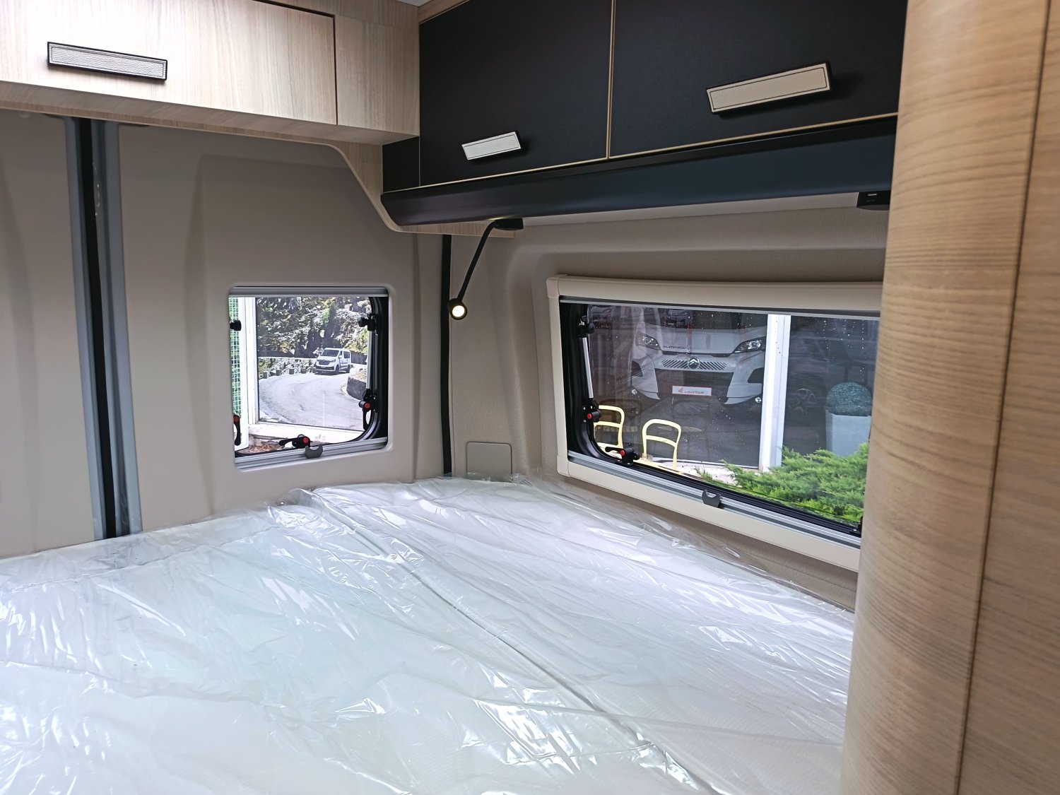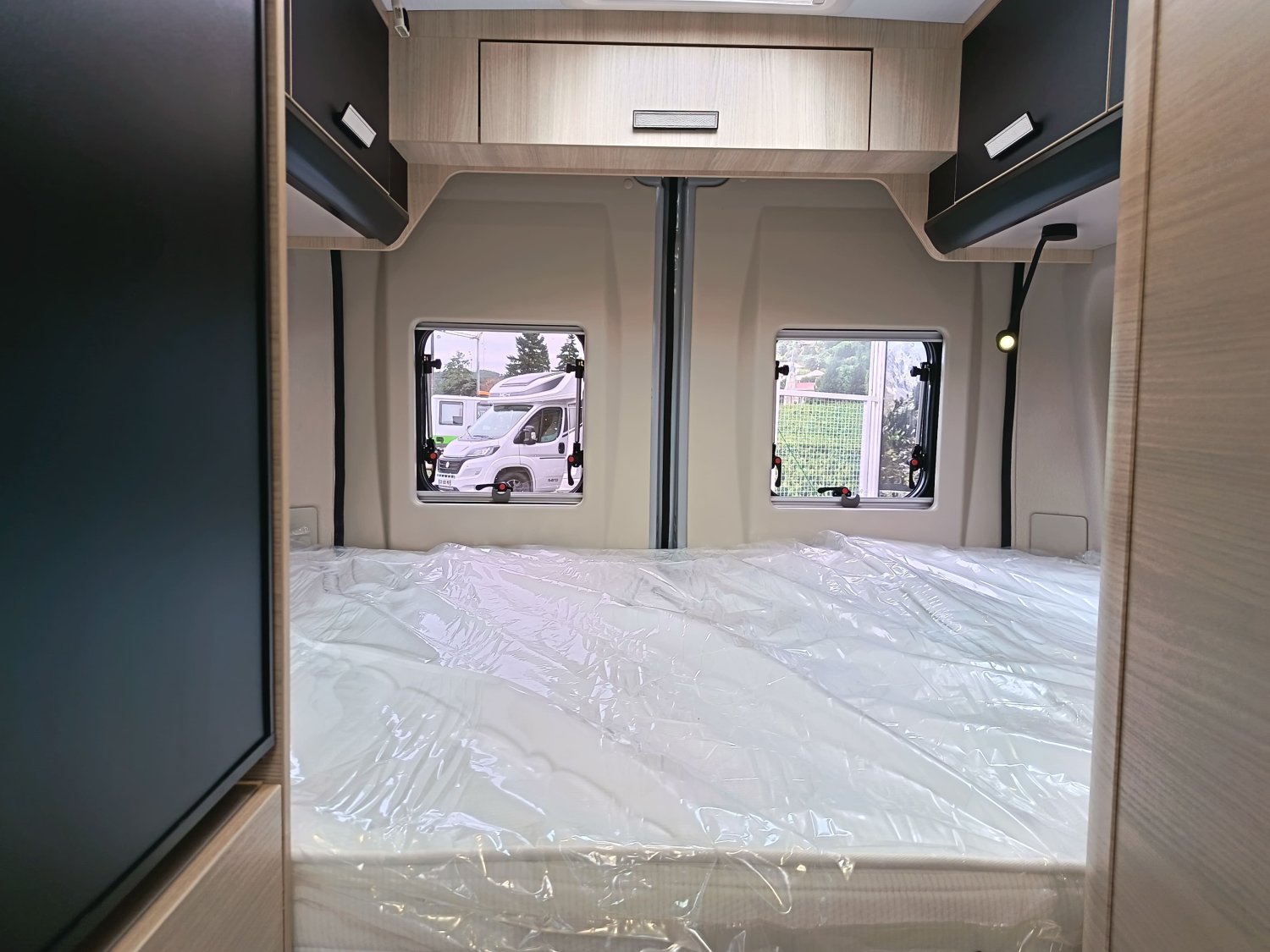 Fourgon de 5m99 avec lit transversal, grande salle d'eau avec paroi rigide, cuisine latérale avec frigo à compression, maxi salon avec sièges cabine pivotants et niche dégagée. Ce véhicule est idéal pour de courts ou de longs séjours, il est également capable d'affronter toutes les saisons grâce à son isolation très performante.
