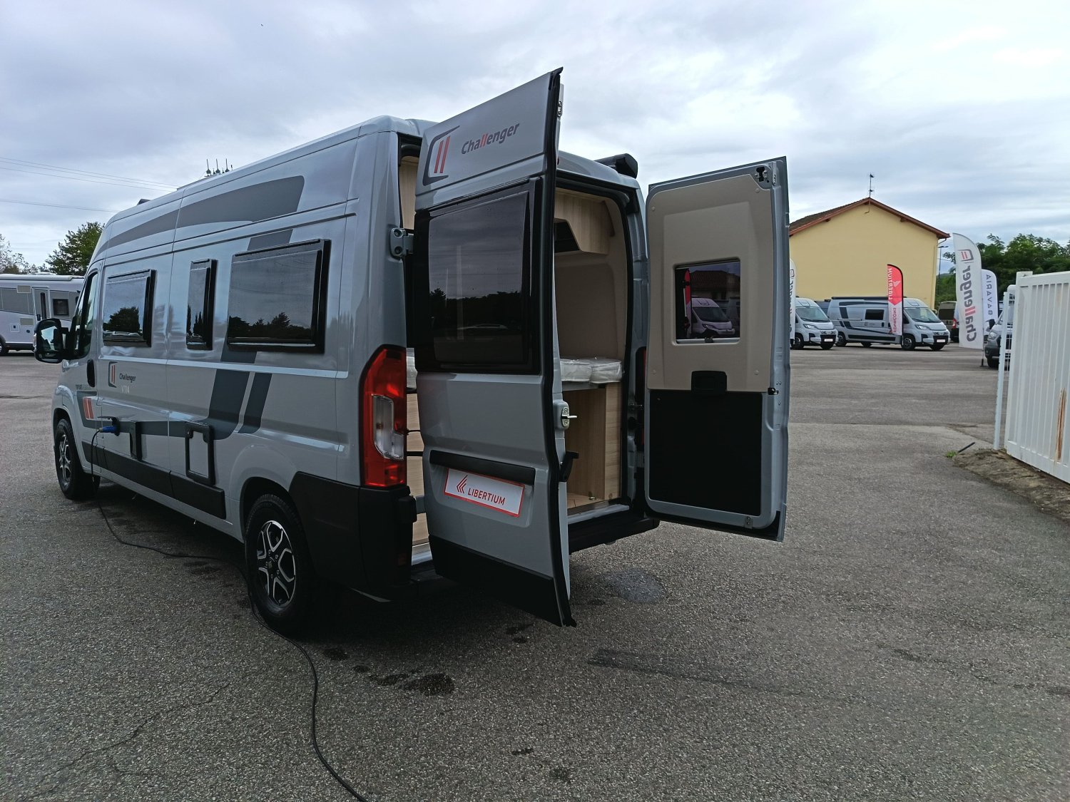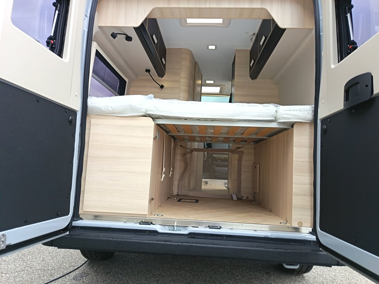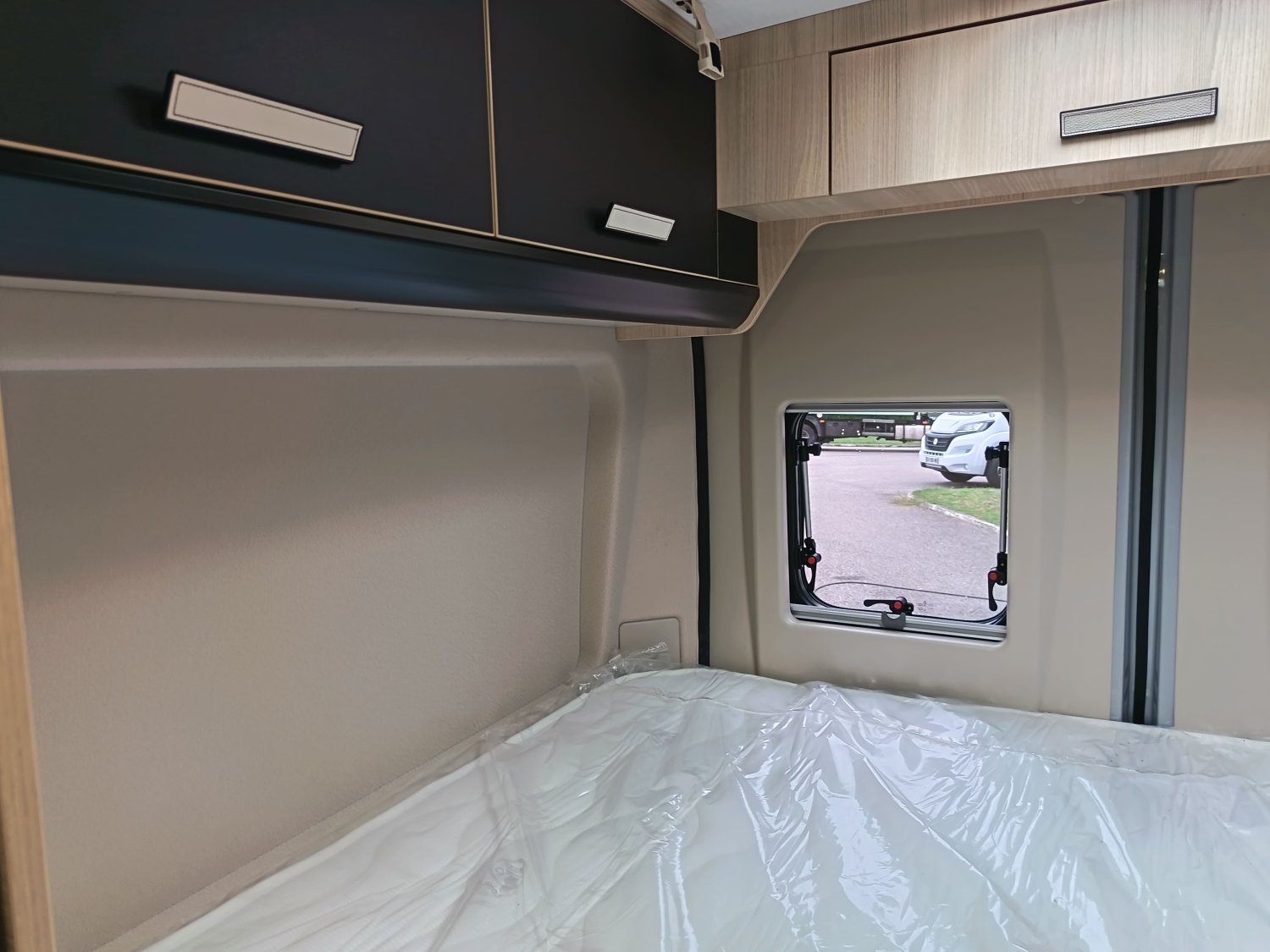 Fourgon de 5m99 avec lit transversal, grande salle d'eau avec paroi rigide, cuisine latérale avec frigo à compression, maxi salon avec sièges cabine pivotants et niche dégagée. Ce véhicule est idéal pour de courts ou de longs séjours, il est également capable d'affronter toutes les saisons grâce à son isolation très performante.