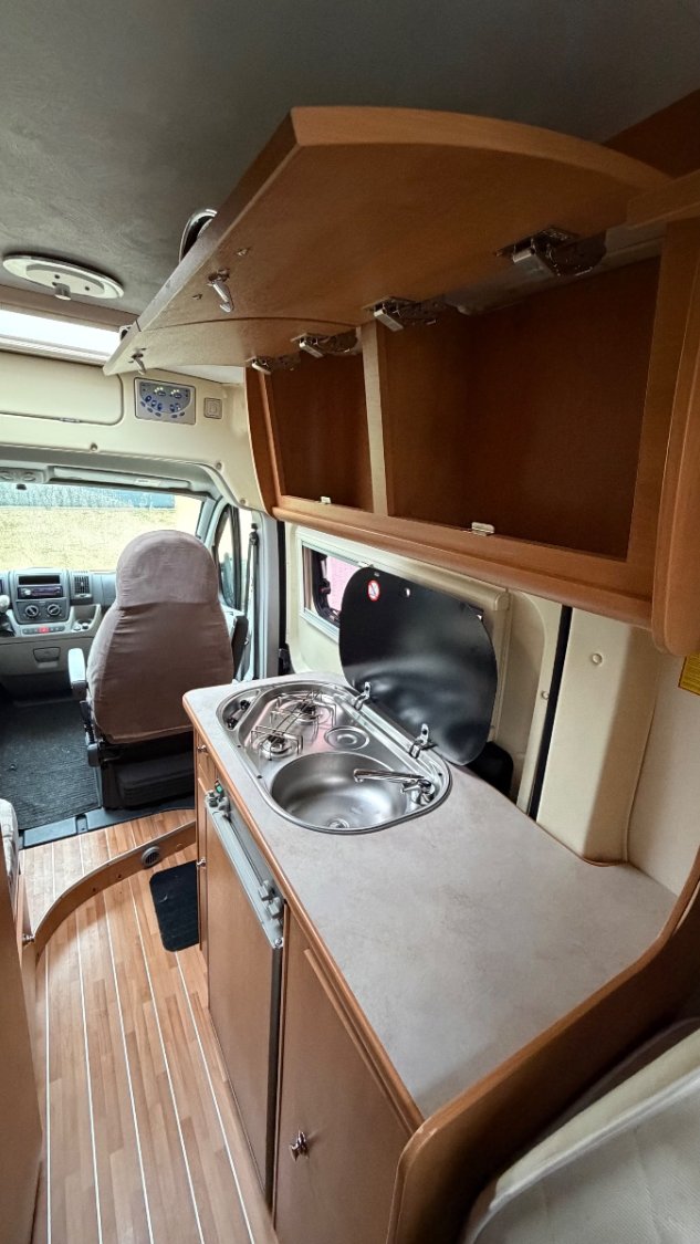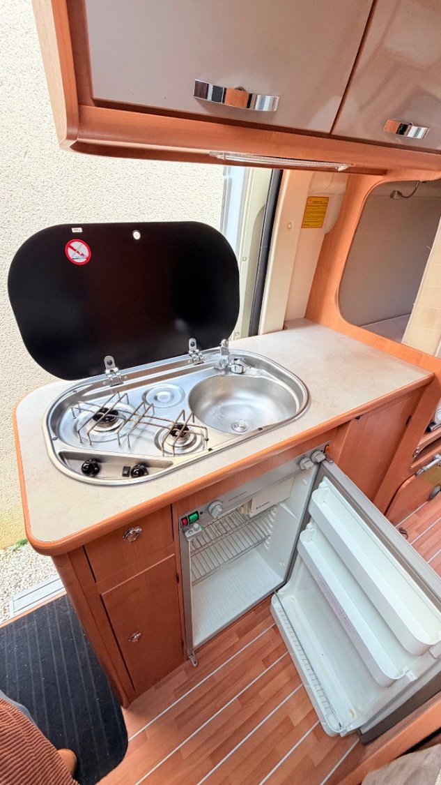 Cuisine latérale : 2 feux gaz, réfrigérateur 80 L (gaz / 12 V / 220 V)
