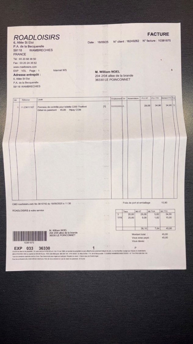 🚽 Panneau de contrôle WC Thetford remplacé (09/2025)