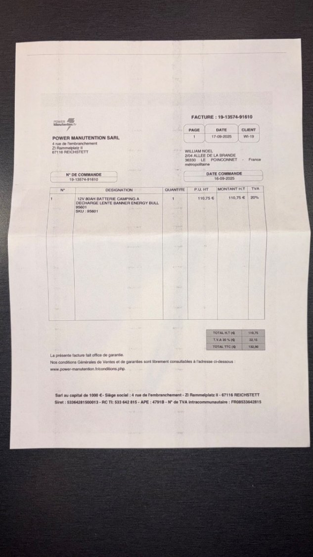Factures fournies lors de la vente et consultables par mail sur demande.