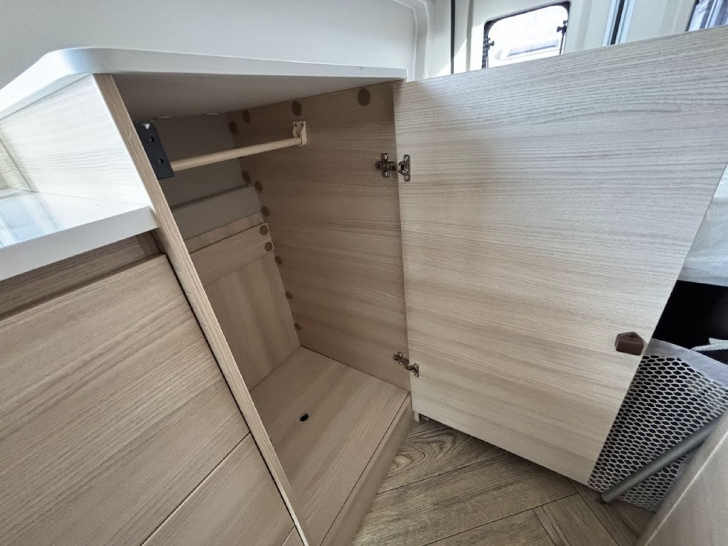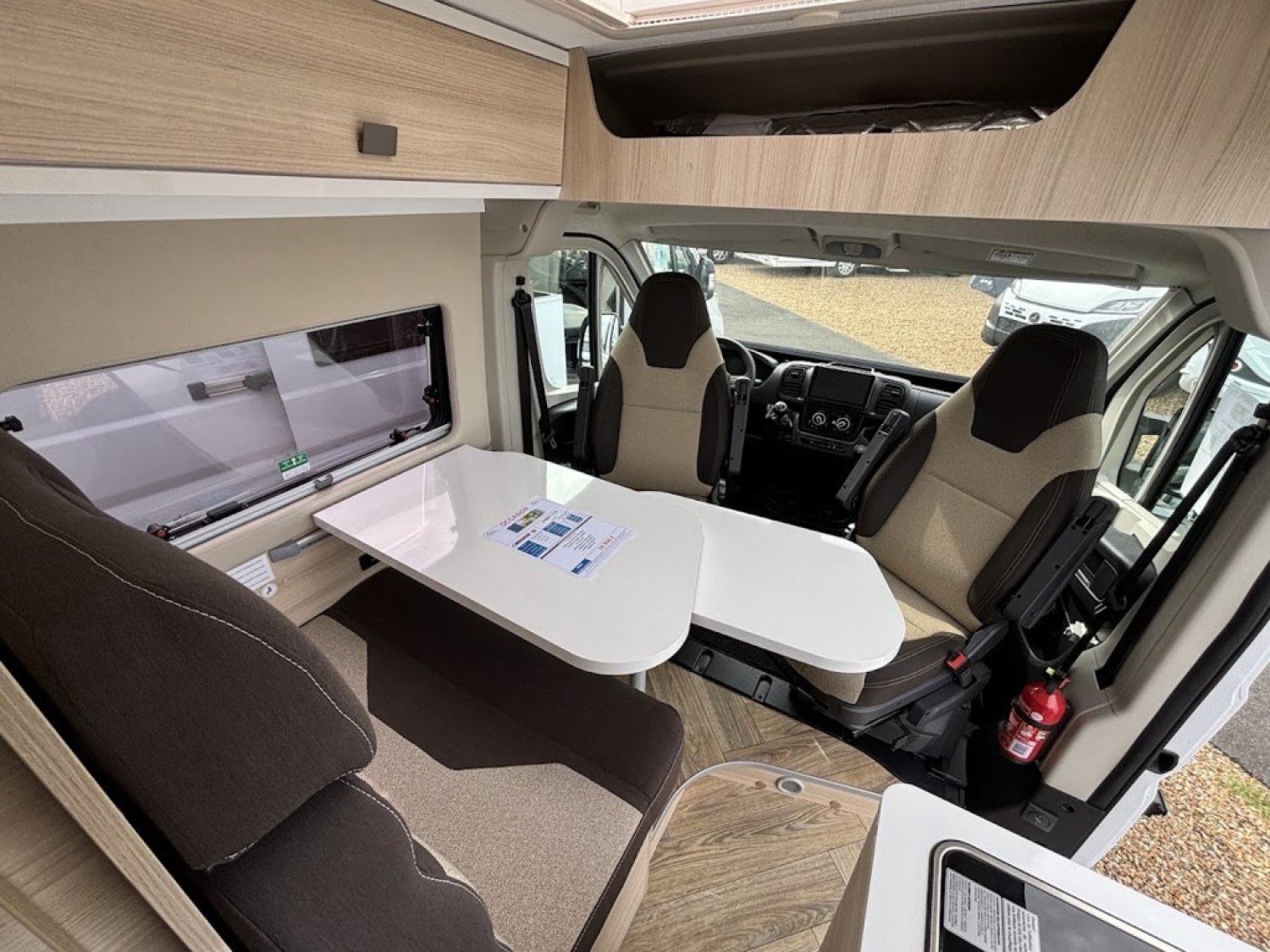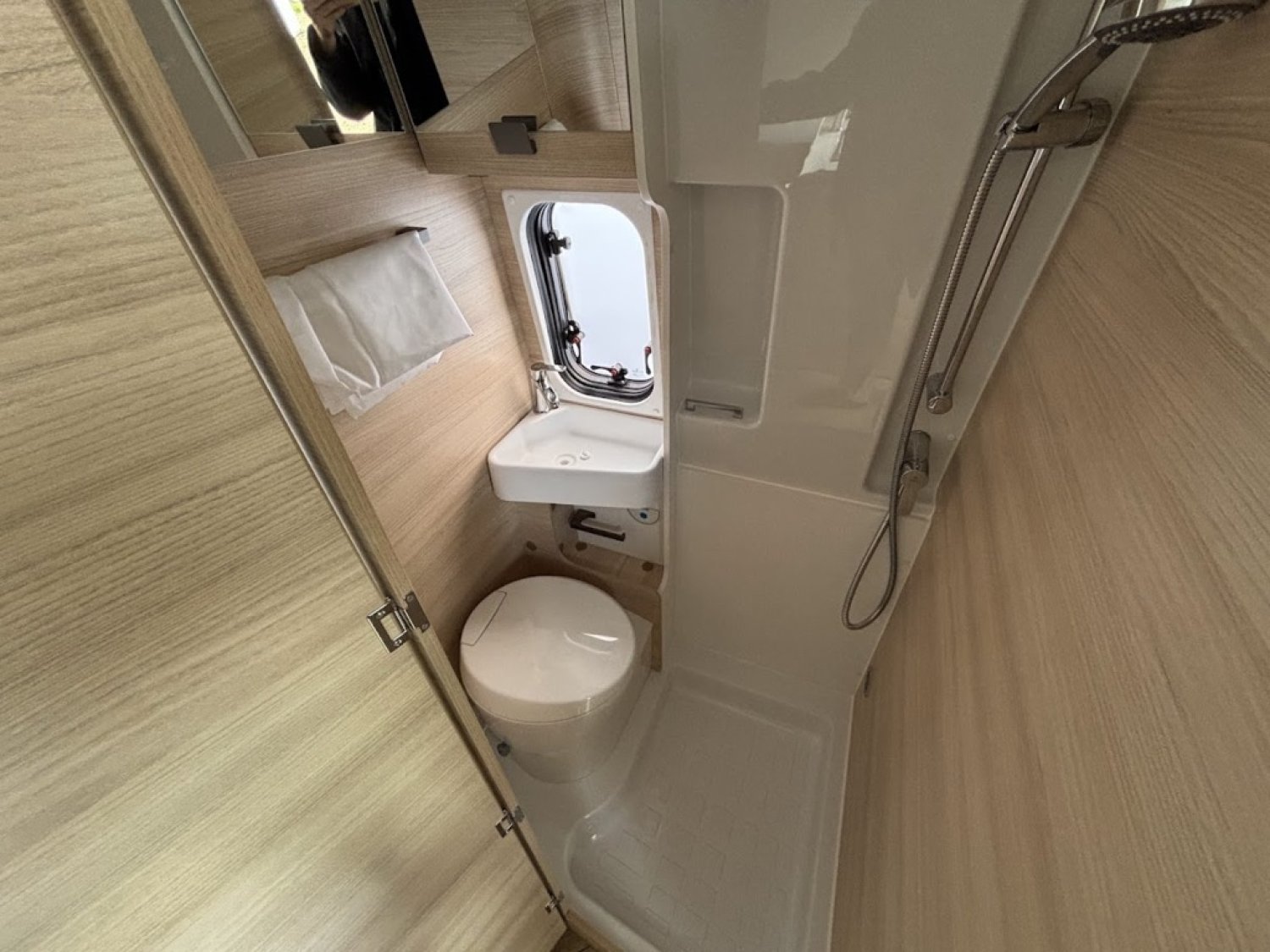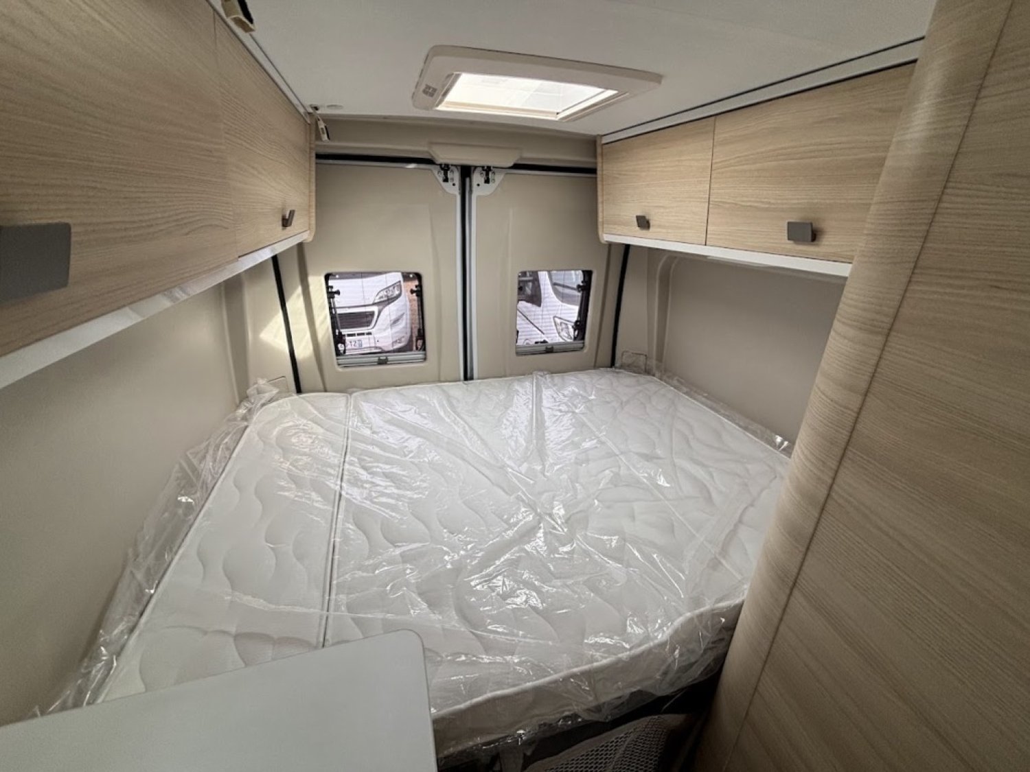 Bac de douche, Cuisine en long, Lit arrière transversal, Lit dînette avant, Salon avant sièges pivotants, WC Cassette.