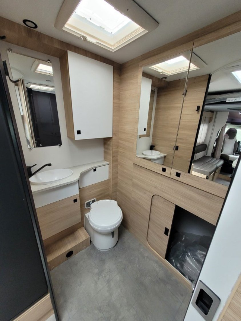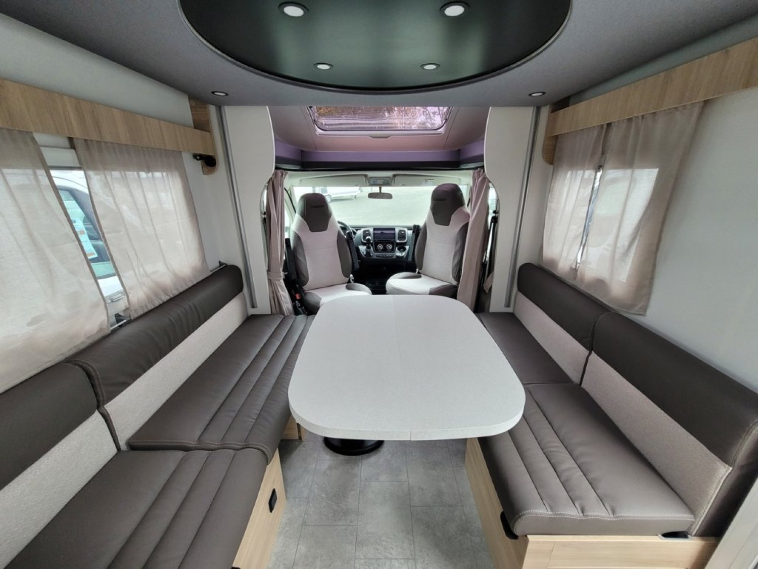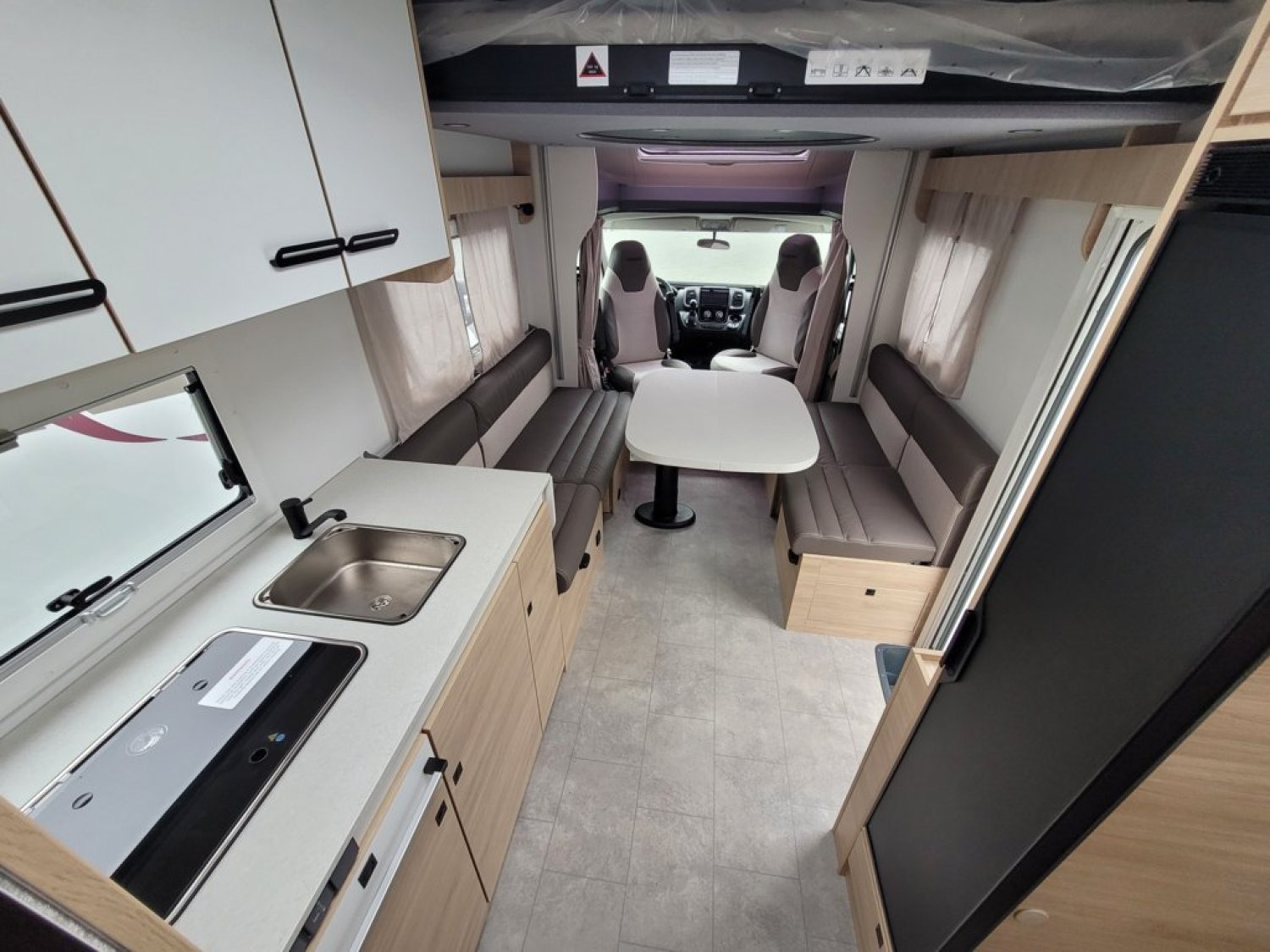Cuisine en long, Douche indépendante, Lit dînette avant, lit pavillon, Maxi salon, Salon avant banquettes face à face, Salon avant sièges pivotants, Soute, WC Cassette.