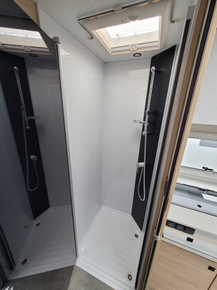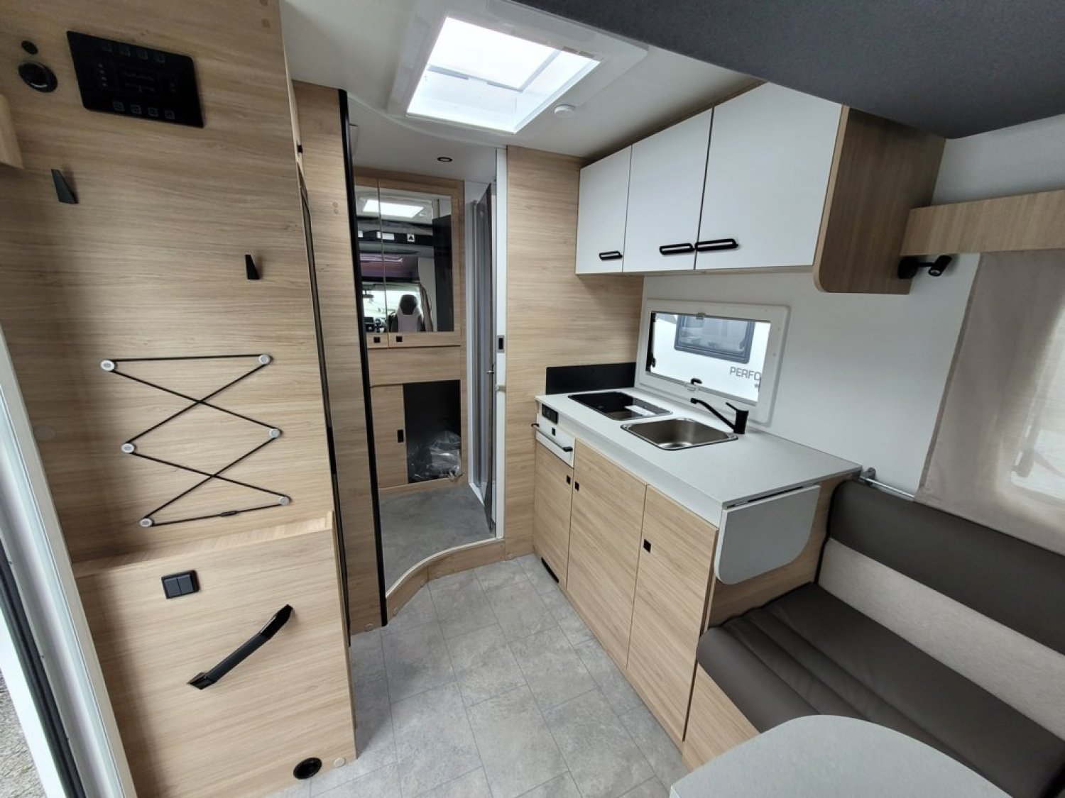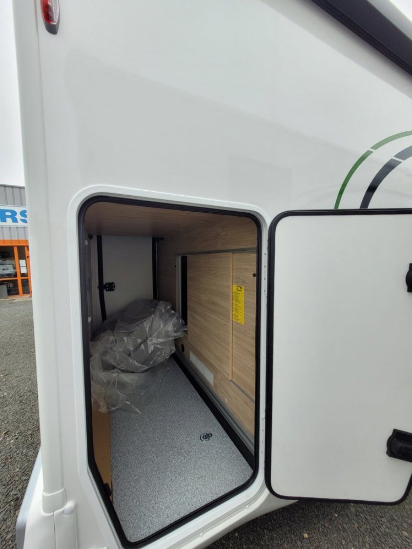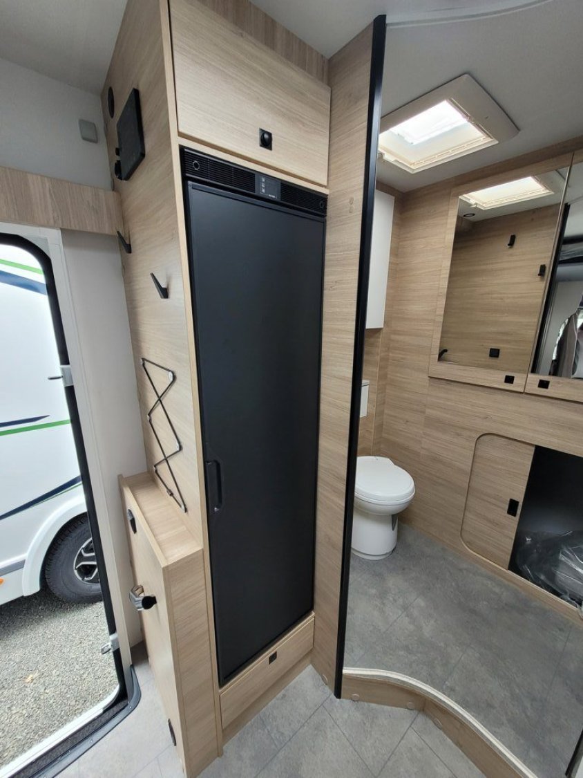 Cuisine en long, Douche indépendante, Lit dînette avant, lit pavillon, Maxi salon, Salon avant banquettes face à face, Salon avant sièges pivotants, Soute, WC Cassette.