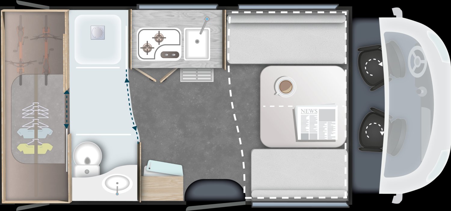 De belles capacités de rangements et de la compacité : Voici le camping-car profilé 650 ! A l'arrière un grand dressing et une soute pour accueillir les vélos, salle d'eau transversale et à l'avant le salon Smart Lounge et un lit de pavillon pour deux. A noter le passage de la porte d'entrée mesure 60 cm de large.