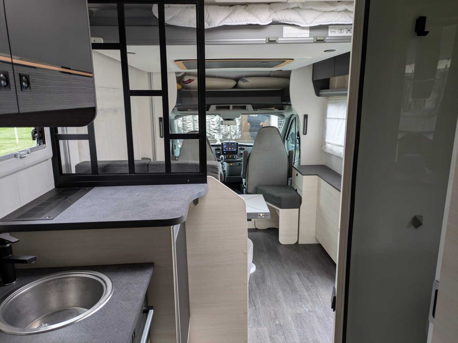 Dès que vous montez à bord, l’atmosphère change. La lumière traverse le lanterneau panoramique, le lit pavillon électrique disparaît ou réapparaît selon vos envies, la cuisine vous accueille comme dans un petit appartement bien pensé. Tout est fluide, tout est simple, tout est confortable.