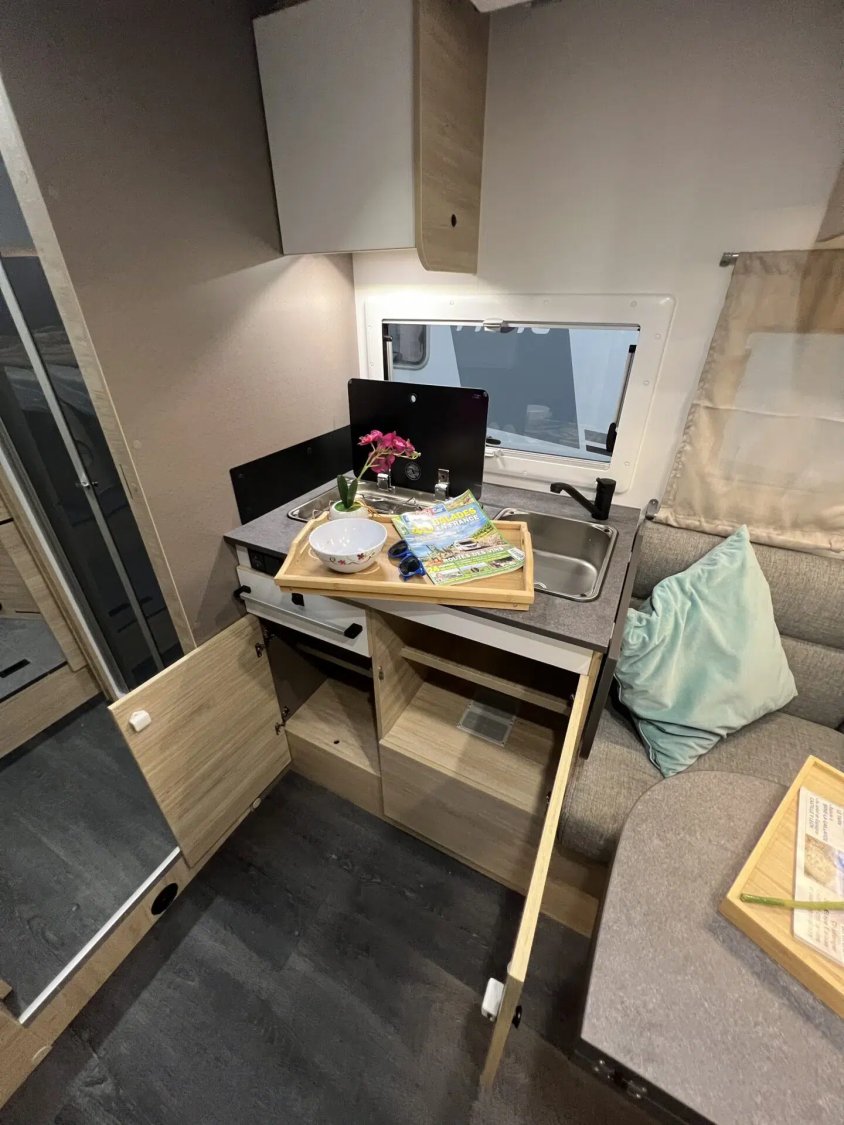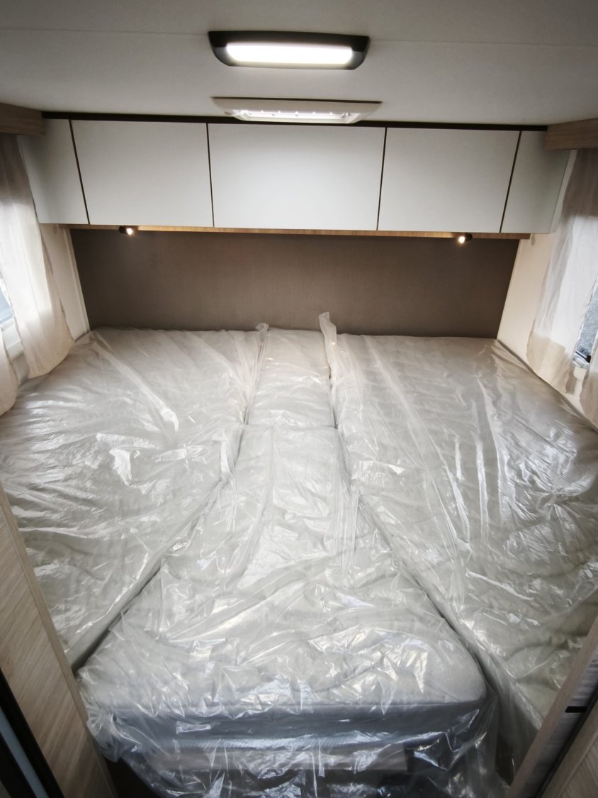 Chausson 777 First Line avec 4 places carte grise et 4 couchages, il propose une configuration confortable avec lits jumeaux transformables et lit pavillon.
