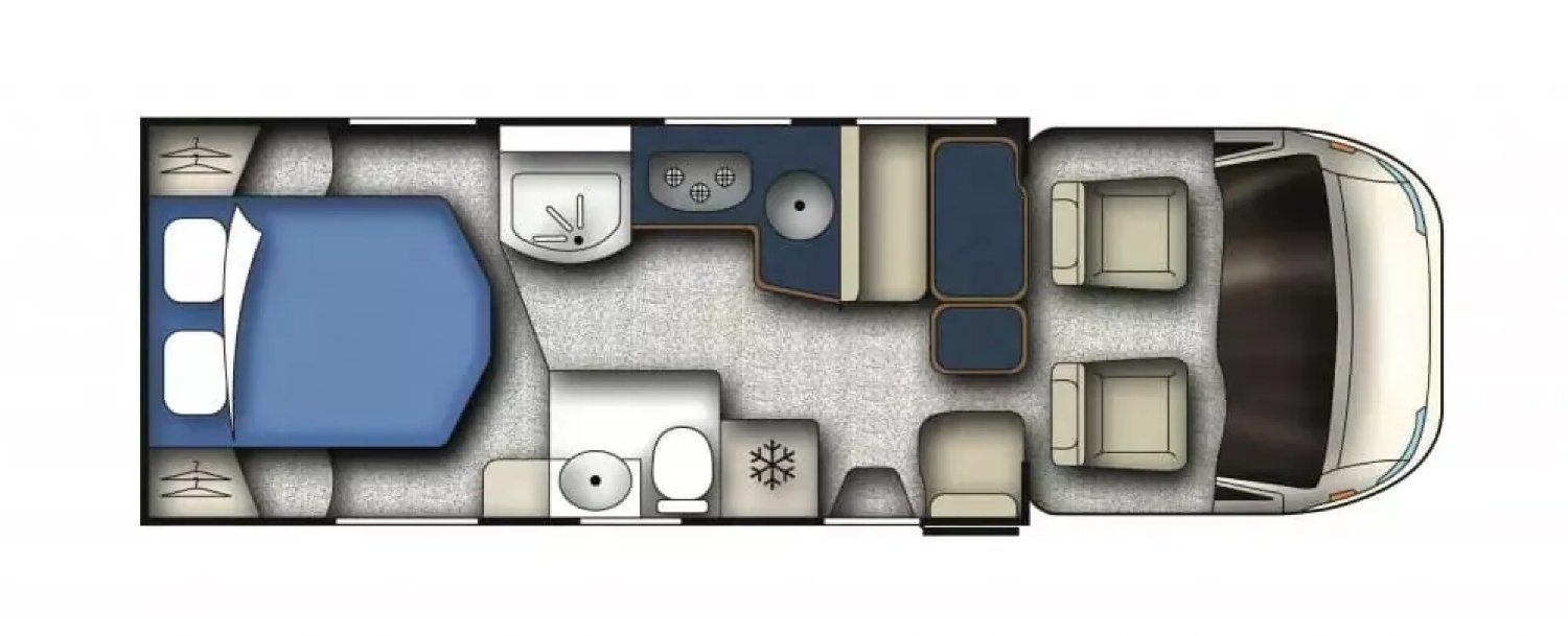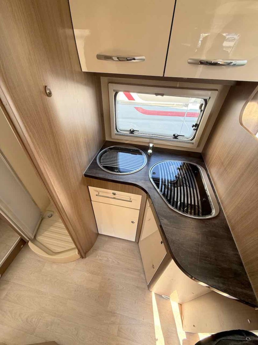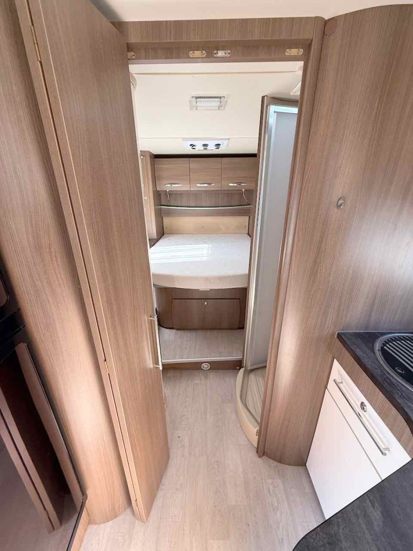 La salle de bain spacieuse, située à l’arrière, dispose d’une douche séparée, de WC à cassette, d’un lavabo et de nombreux rangements.