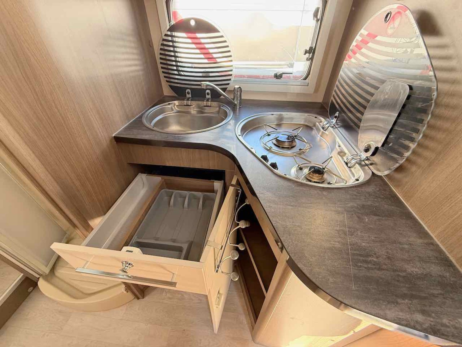 La cuisine en L, élégante et fonctionnelle, comprend un évier, un réchaud 3 feux, et un grand réfrigérateur 140 L avec conservateur.