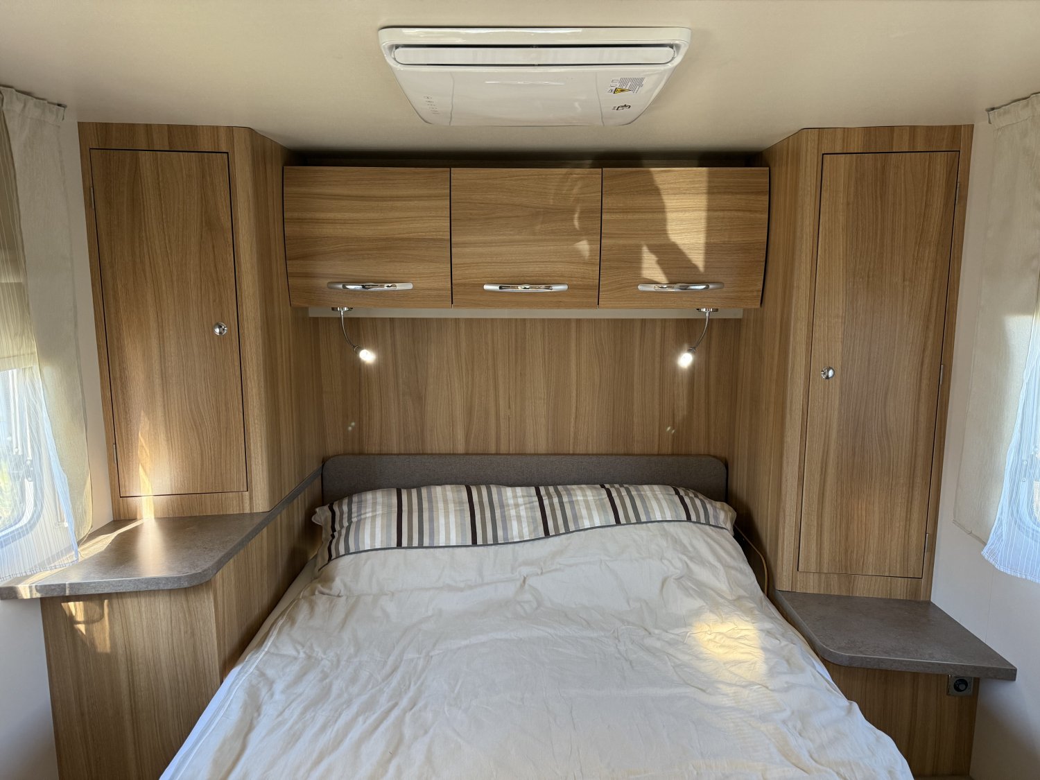 Ce Chausson Flash 49 EB de 2013 est un profilé pensé pour voyager confortablement, avec un vrai lit central réglable en hauteur au-dessus d’une soute généreuse. Grâce au système Easy Bed, on choisit la hauteur du lit selon les besoins de rangement, ce qui permet d’embarquer du matériel ou des bagages sans sacrifier le confort à bord.