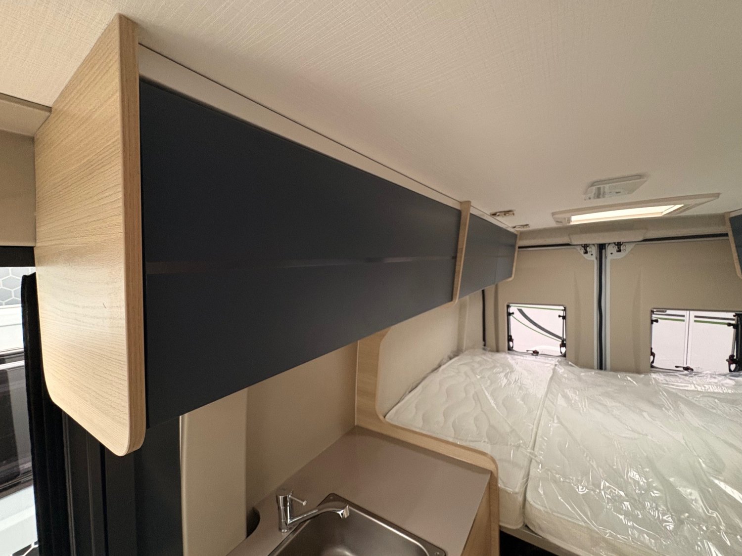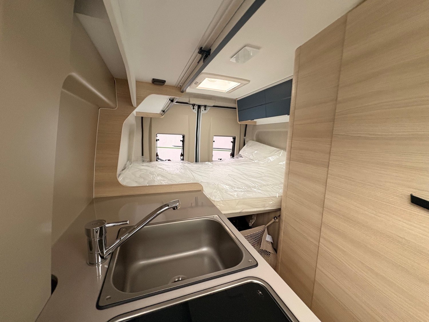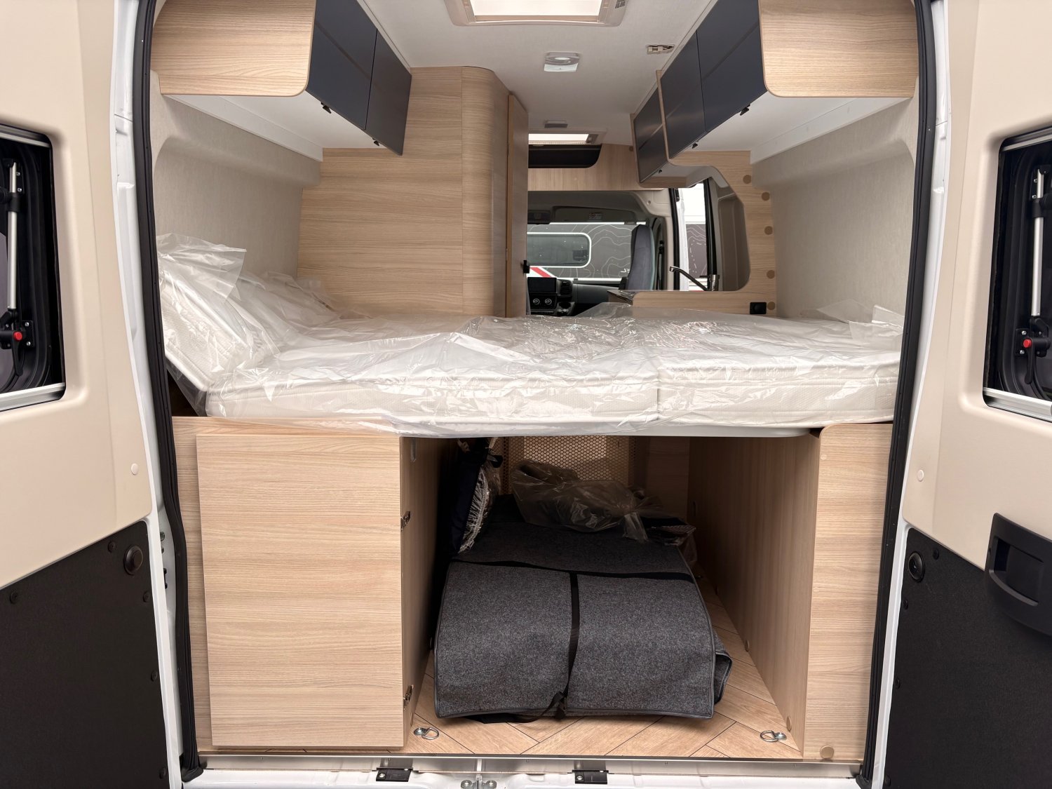C’est le grand frère du V594S, décliné ici en 5.99 mètres offrant ainsi plus d’espace et la possibilité d’un couchage d’appoint pour un enfant. Astucieuse salle de bains (avec douche, lavabo et WC) et lit arrière de grande dimension, relevable si besoin d’espace. Assurément l’un des plans les plus éprouvés (et appréciés) sur le marché du fourgon aménagé.