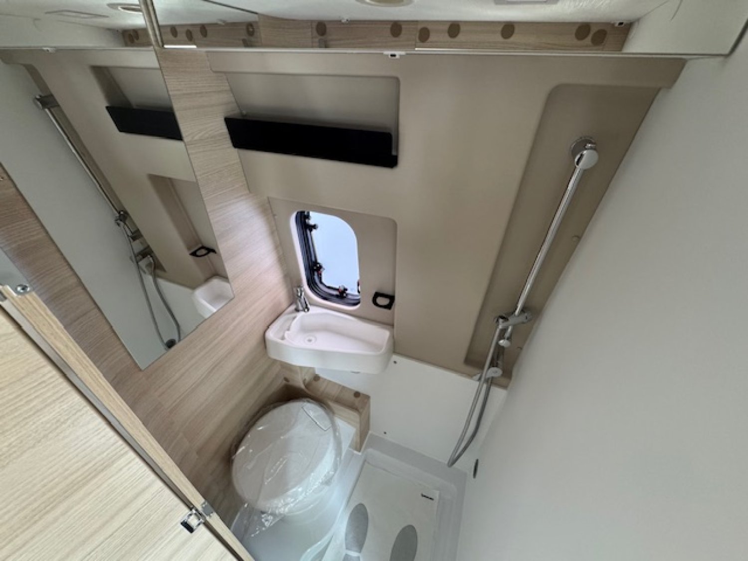 Il présente 4 vraies places couchage avec ses 2 lits arrières transversaux en superposés (en bas 186x145 et en haut 184x133 ) avec une penderie, une salle de bain douche WC, un chauffage combiné gaz Truma 4000 performant et une cuisine toute équipée !! Tout cela en 5,99 mètres de long.
