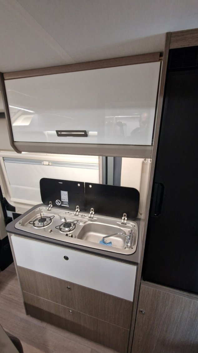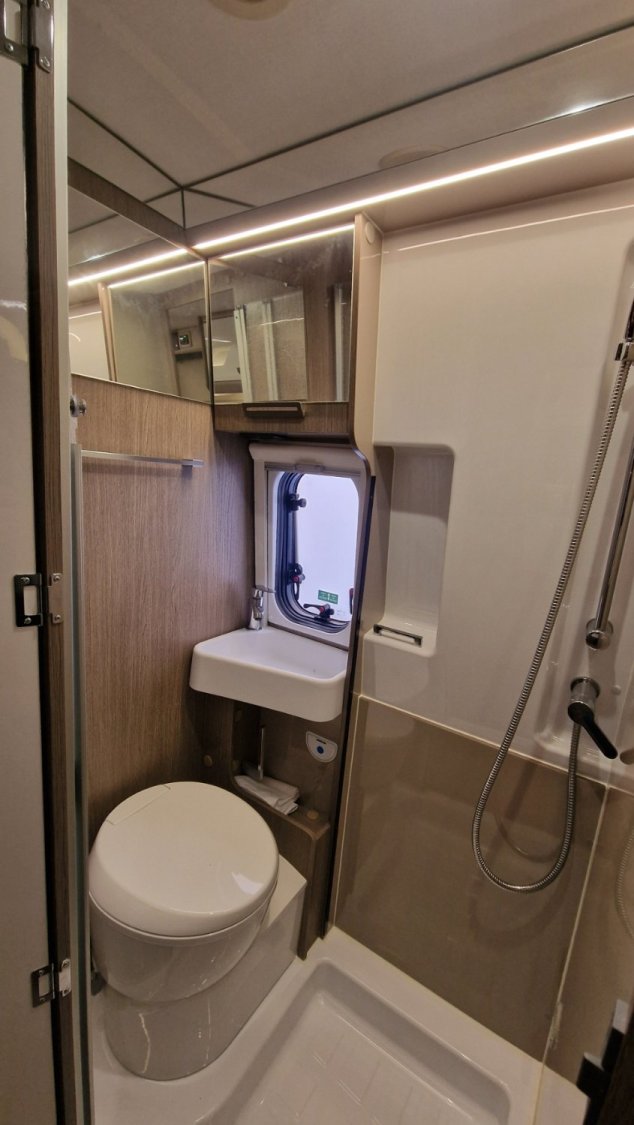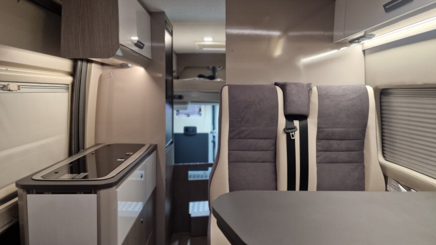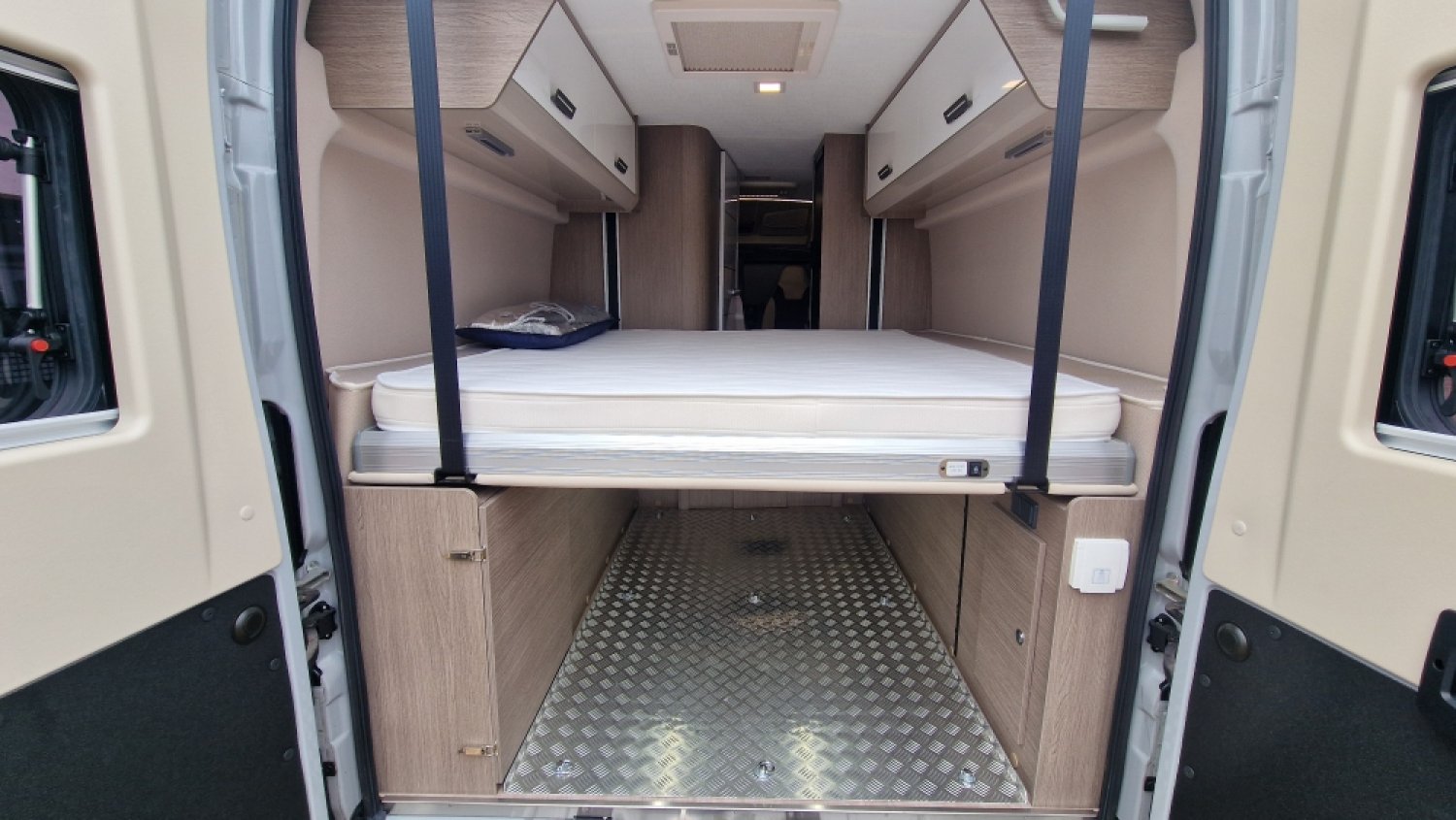Il est doté d’un véritable garage et d’un véritable couchage aux dimensions XXL. Son secret ? Un lit de pavillon électrique (au-dessus du garage) qui peut être accessible sans échelle si le garage n’est pas utilisé.