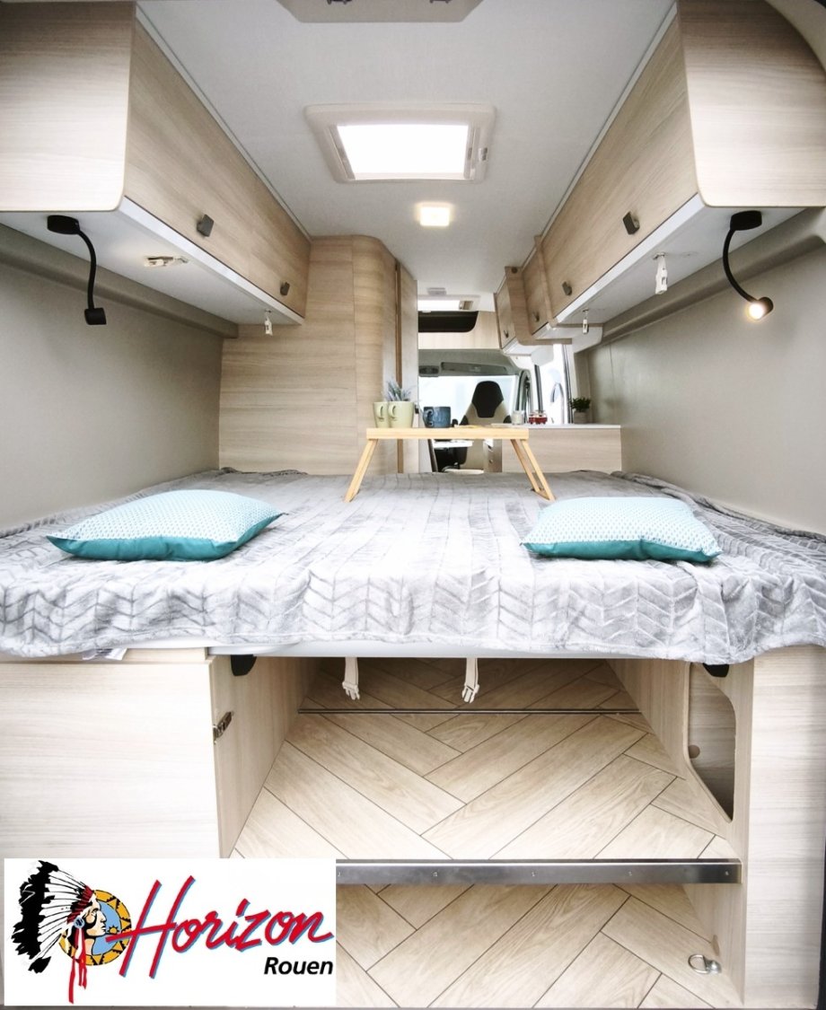 Avec le V697, Chausson réussit le difficile pari d’implanter 2 lits jumeaux de belles dimensions dans un fourgon de seulement 6.36 mètres. Vous aimerez ses astuces de rangements comme son double plancher sous lit pour stocker table et chaises de camping. Idéal pour un couple qui souhaite voyager partout, en toute discrétion.
