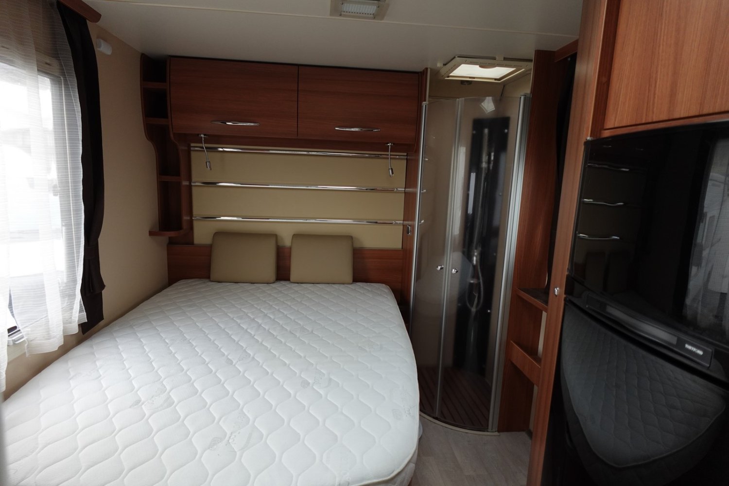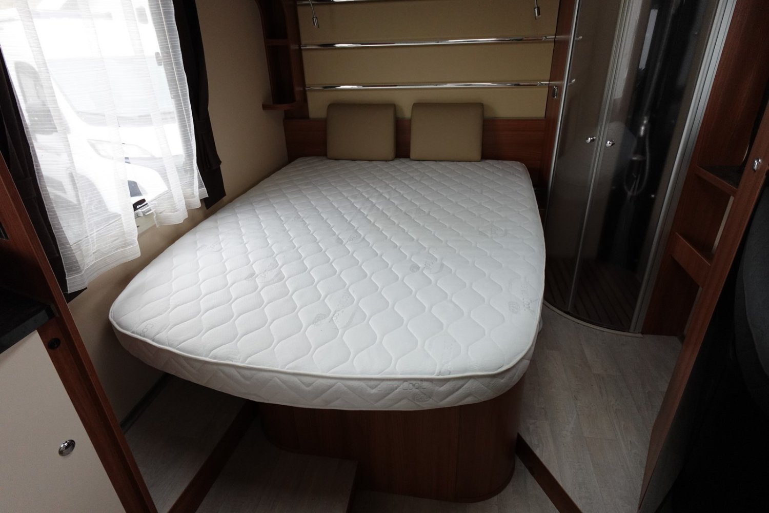Profilé de moins de 7 mètres comprenant un lit central décalé, une douche indépendante de l’espace WC/lavabo, une cuisine avec de nombreux rangements, un salon avant panoramique et un lit de pavillon.