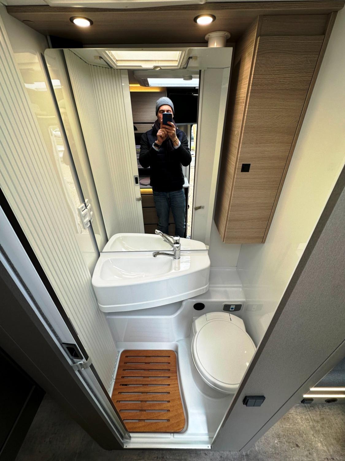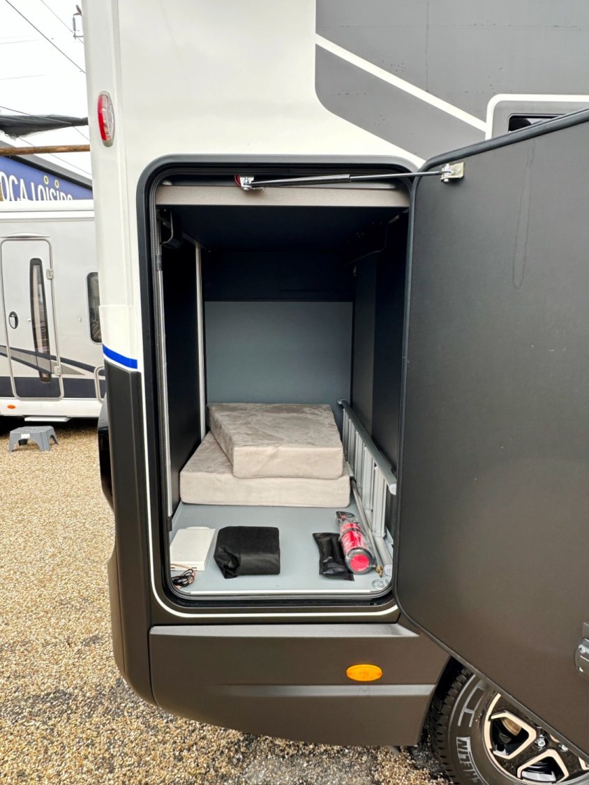 Profilé hybride Chausson, lit pavillon électrique, 4 couchages, salle de bain Vario convertible en vaste douche, cuisine droite spacieuse et tout équipée, immense salon avant avec sièges pivotants et table centrale convertible en couchage double, vaste soute arrière modulable (plusieurs vélos adultes) et grand dressing.