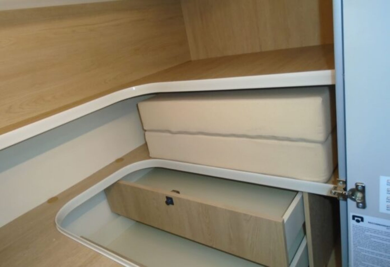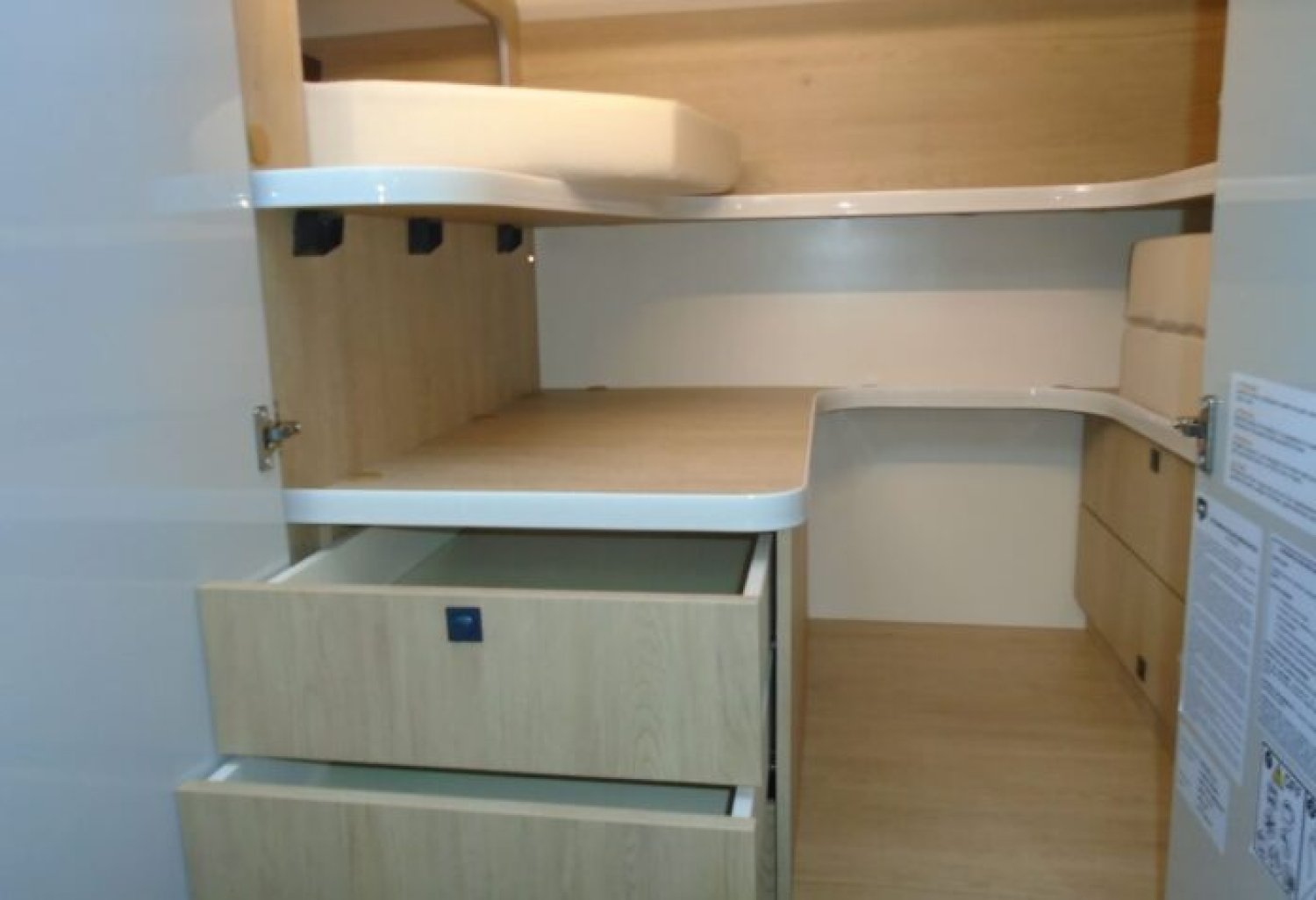 Pack ford : motorisation 165 CV, feux diurnes, boites à gants avec serrure, habillage intérieur et tableau de bord finition « tren », pare chocs et bas de caisse latérales peints couleur carrosserie, porte avec 2 points fermeture, fenêtre et fermeture centralisée, panneau solaire 200W avec régulateur MPPT, panneau de commande CP plus, skyroof, couvercle évier, housses de sièges cabine, store occultants plissées cabine. Frigo trimixte 137L, chauffage truma combi 4