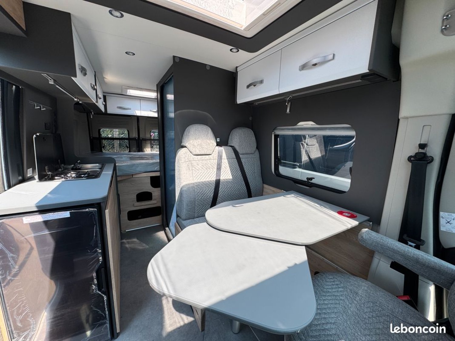 Equipements de série : Système de freinage antiblocage (ABS), programme électronique de stabilité (ESP), contrôle de traction (TCS), antibrouillard, assistant de démarrage en côte (assistant de vent latéral, assistant de freinage de sécurité, protection en cas de retournement) Jantes Alu 16 pouces Store extérieur Tiroir coulissant ergonomique à l’arrière Chauffage Truma Combi 4 2 bouteilles de gaz 13 kg chacune avec Crashsensor Volant et pommeau de vitesse gainés de cuir Feux de jour à LED Baie à cadre haut de gamme Pare-chocs laqué, identique à la couleur de la carrosserie Eaux propre 100 L – eaux usées 90 L Réfrigérateur à compression en position haute de 84 l, congélation de 6 L Lit arrière 197 x 157/140 cm et Lit dinette 168 x 101 cm –