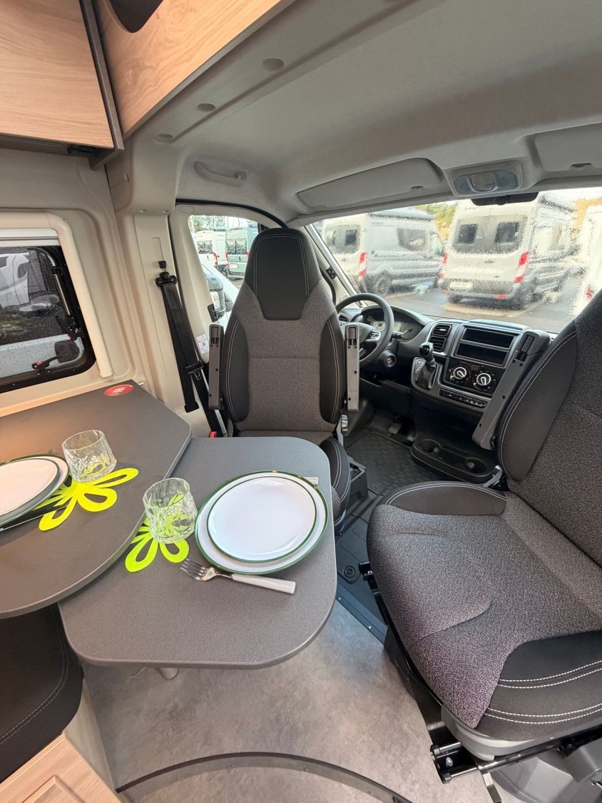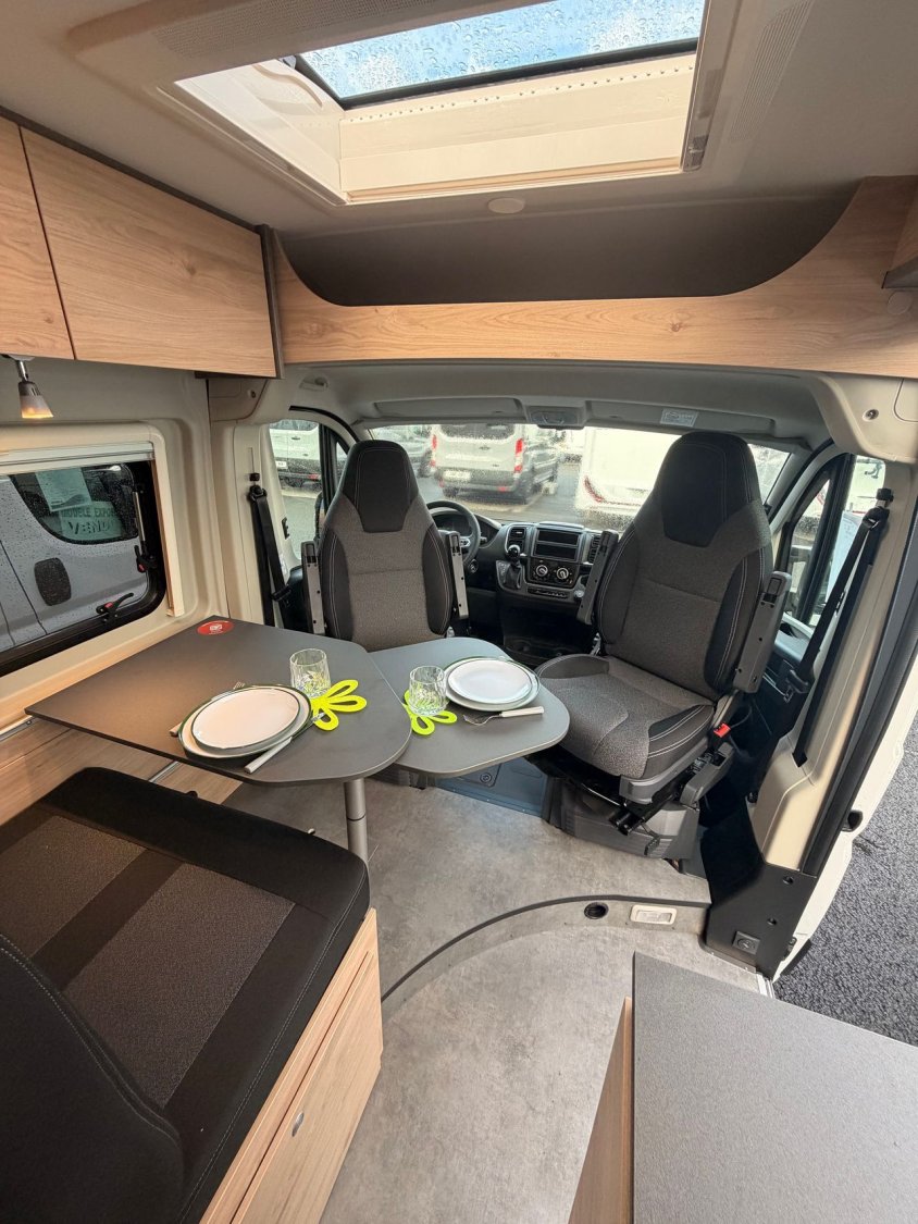 - Pack active : (Jantes aluminium 16'' (boîte manuelle : jantes noires, automatique / maxi : jantes bicolores), Volant et pommeau de levier de vitesses en cuir,Techno Tri, Prise USB (remplace l'allume-cigare), Store plissé dans la cabine de conduite, Moustiquaire de porte, Marchepied électrique, Baie dans cabinet de toilette, Lanterneau Midi-Heki 70 x 50 cm au-dessus de la dînette avec moustiquaire et store occultant, Rallonge de table pivotante, Pré-câblage pour caméra de recul, Pré-équipement pour panneaux solaires, Pré-équipement TV 12V & prise TV, raccordement satellite, Bandes lumineuses à LED, Prise 230V dans le meuble haut avant gauche (dînette), Prise 12V à l'arrière, en bas à gauche, Double prise USB dans la partie arrière gauche)