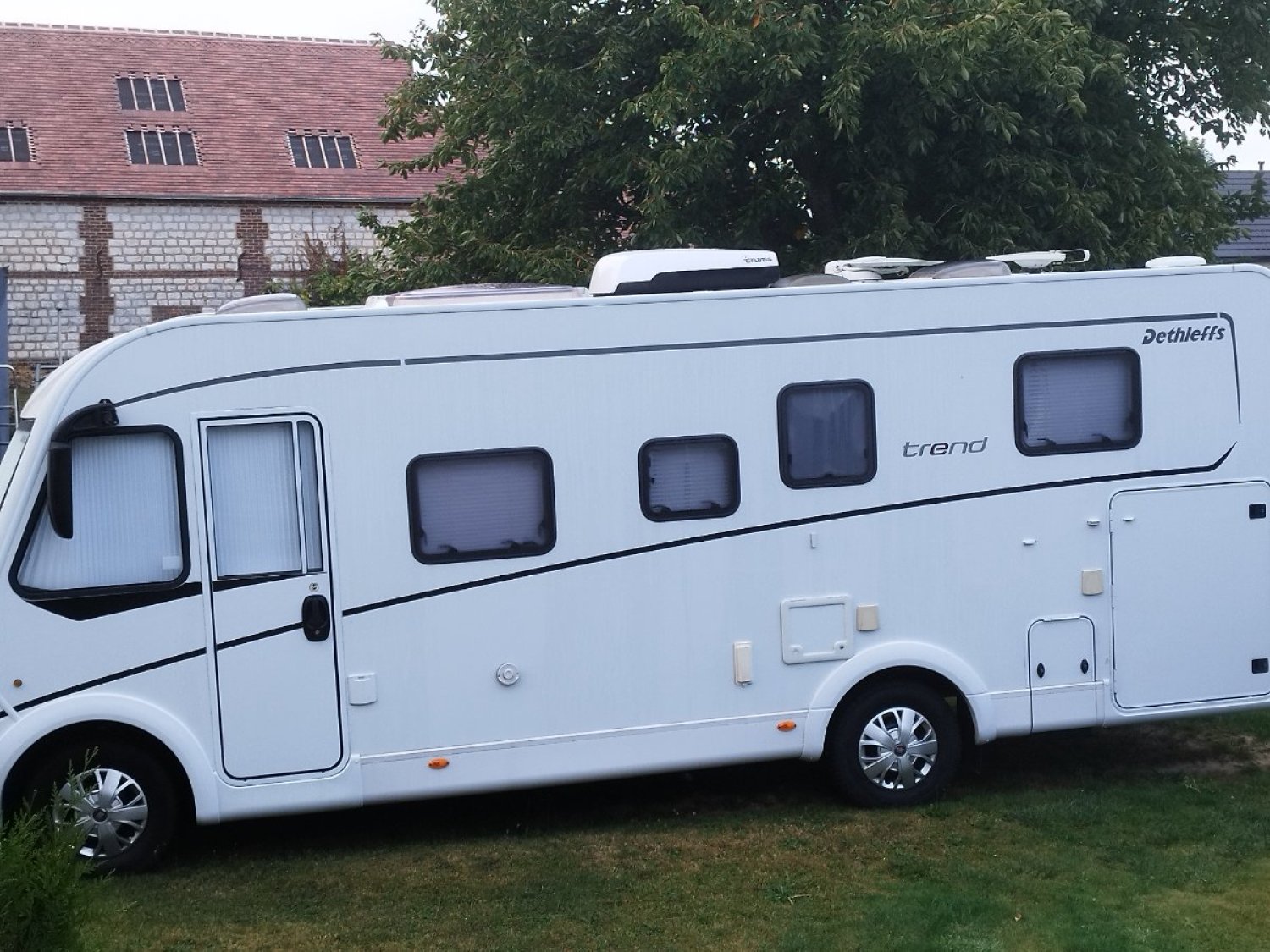 Camping-car intégral DETHLEFF Trend I7057DBL Blanc 4 places CG 4 couchages lit central à l'arrière, lit pavillon à l'avant (150x190). Porteur Fiat 140CV , boite de vitesse mécanique, consommation moyenne 10l/100. Raidisseur de suspension à l'avant, suspension pneumatique à l'arrière, équipé du Fiat hill descent control (system permettant d économiser les freins dans des grandes descentes sinueuses), traction +, climatisation cabine automatique numérique, feux diurnes, panneau solaire, batterie cellule AGM.