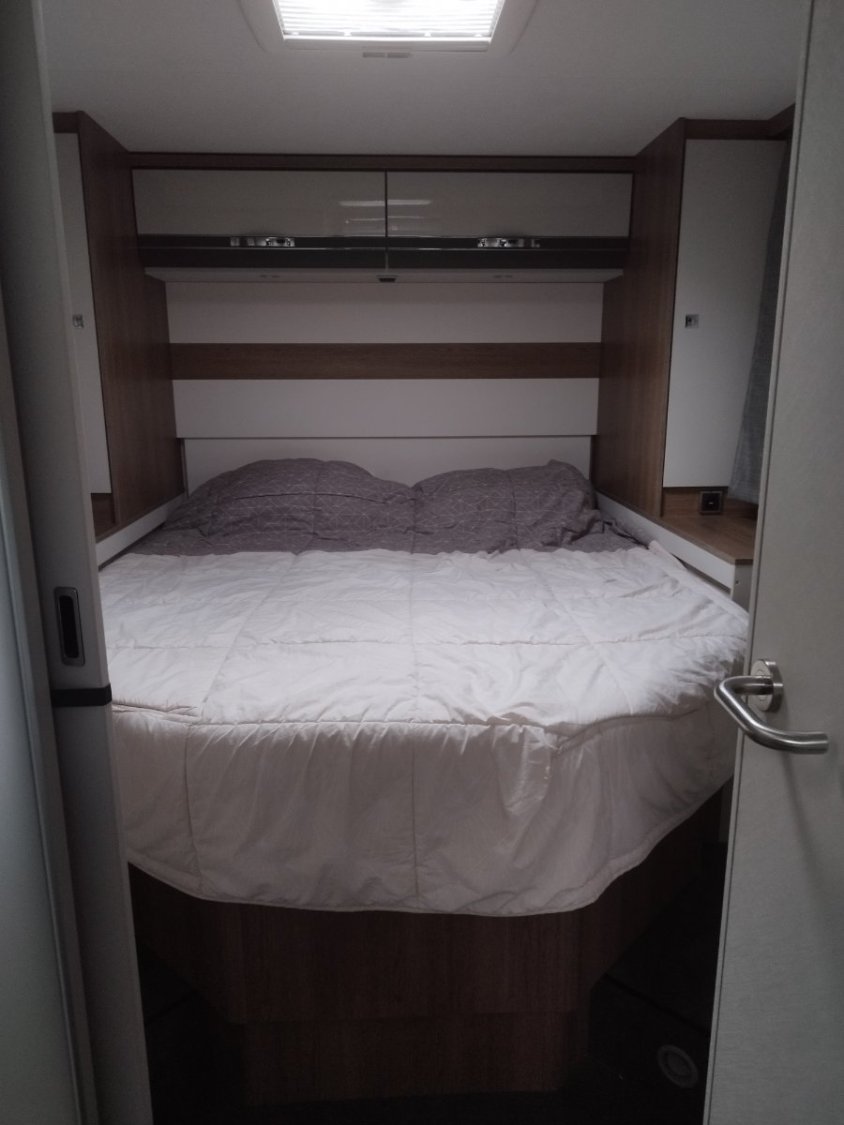 Chambre arrière avec lit central 150/200 (réglable en hauteur manuellement), nombreux placards de rangement, penderie de chaque côté du lit, et téléviseur.
