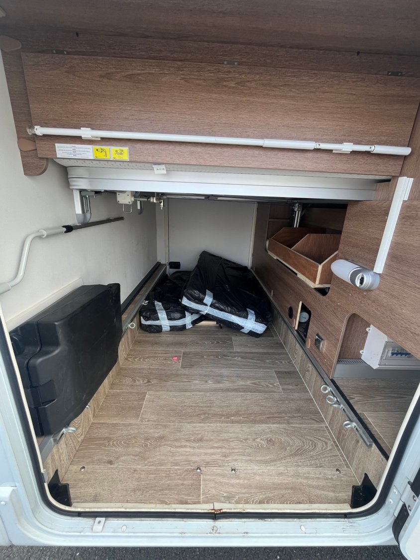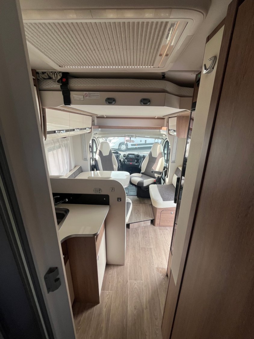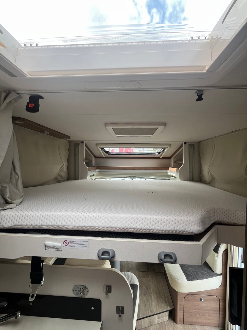 Un camping-car avec salon confortable, un lit double réglable en hauteur dans la chambre à coucher séparable ainsi qu'une salle de bain spacieuse avec douche et toilette séparé