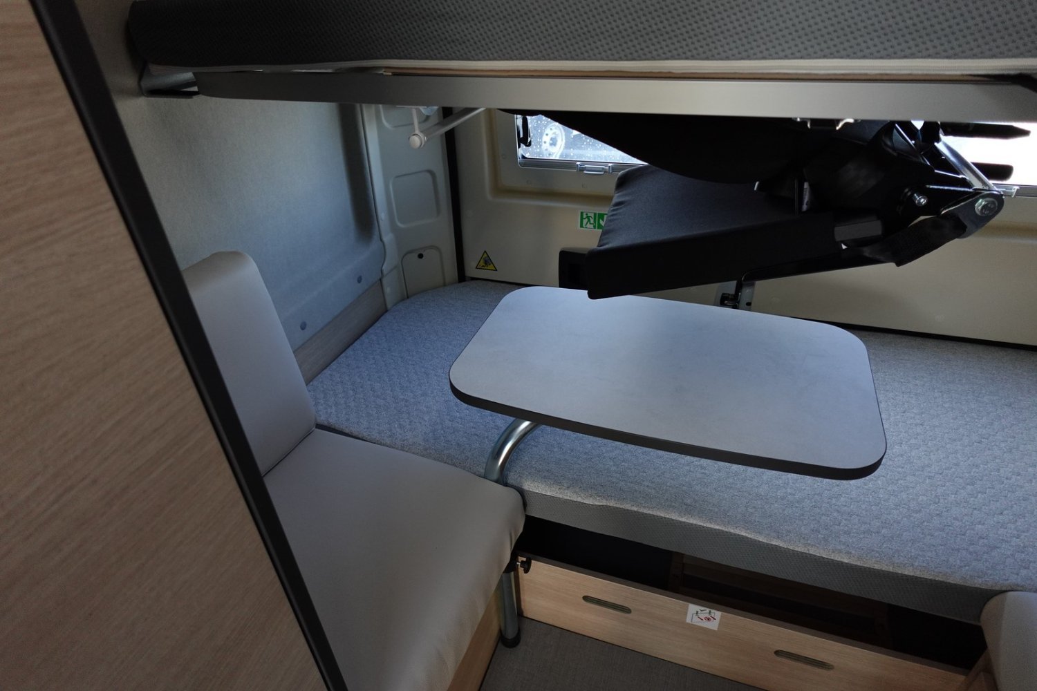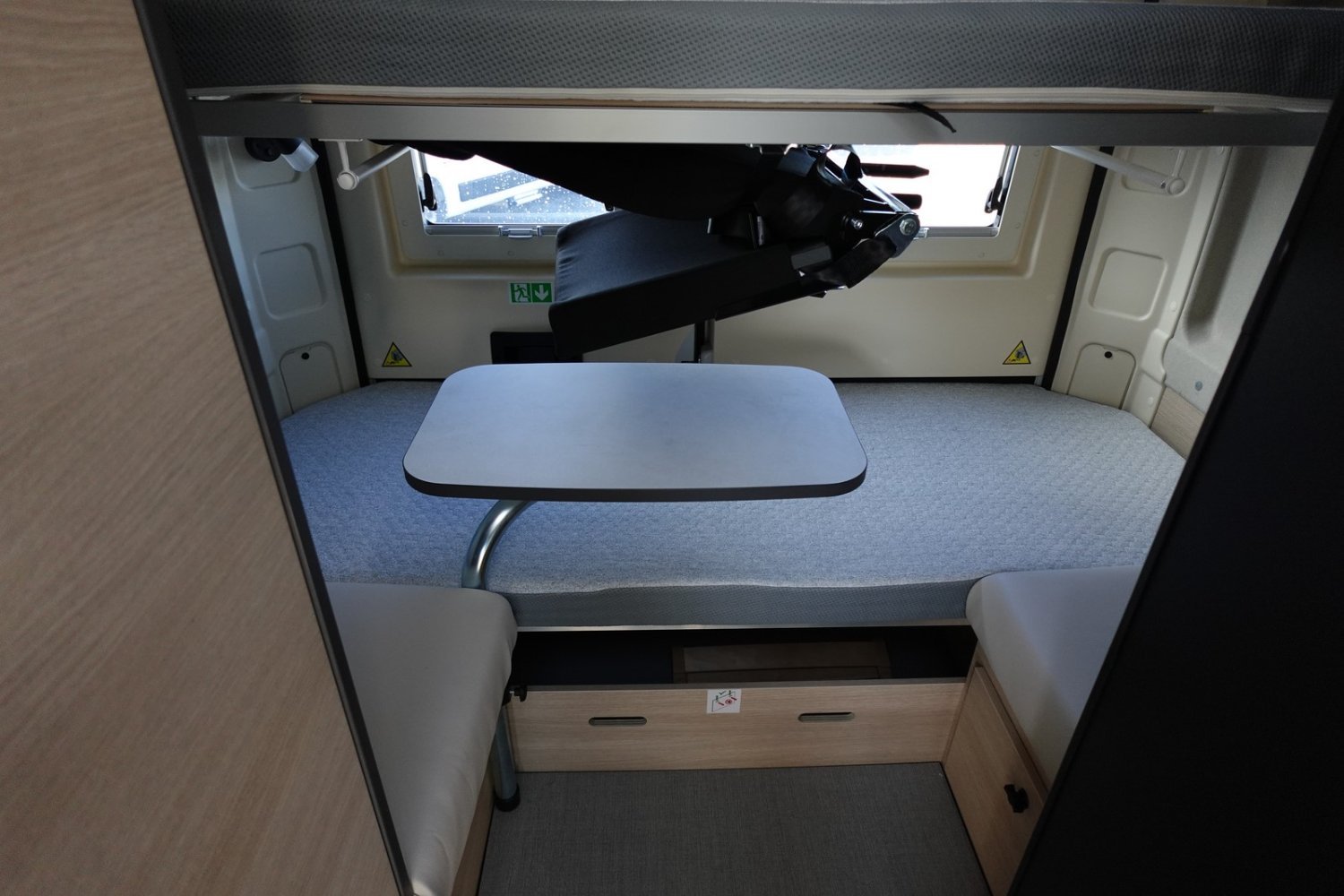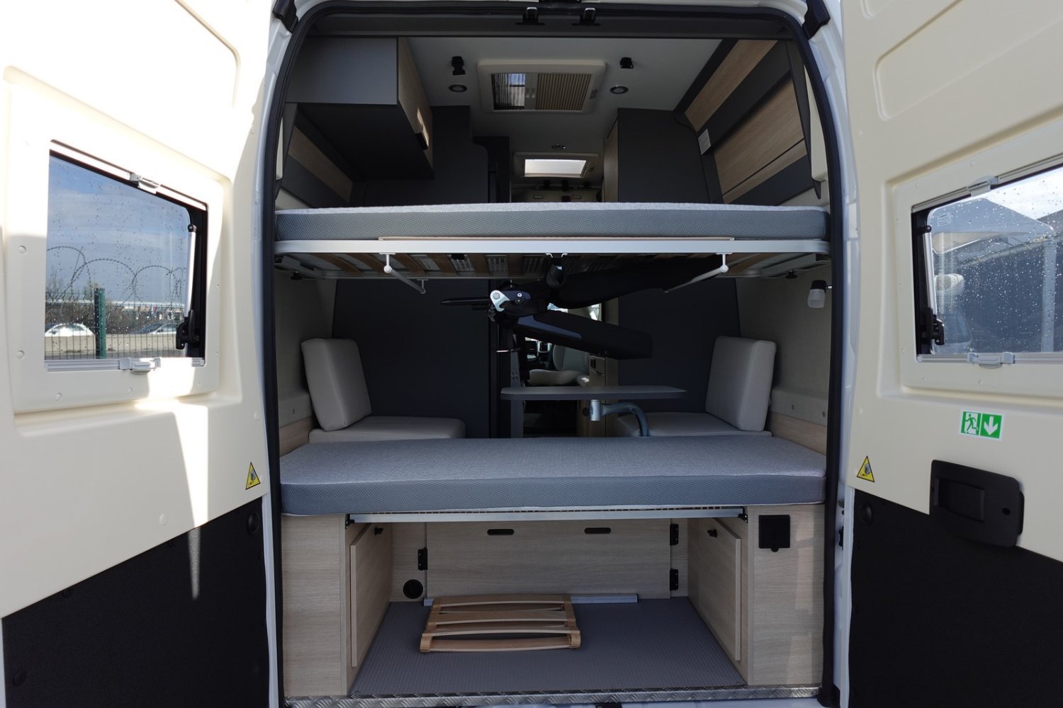 Fourgon aménagé familial comprenant un salon avant panoramique, une salle d’eau avec douche et WC, des lits superposés arrière avec salon enfant, une cuisine avec de nombreux rangements et un lit de pavillon 2 places. 5 places couchage et 5 places carte grise.