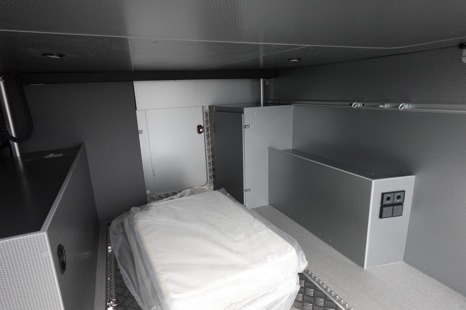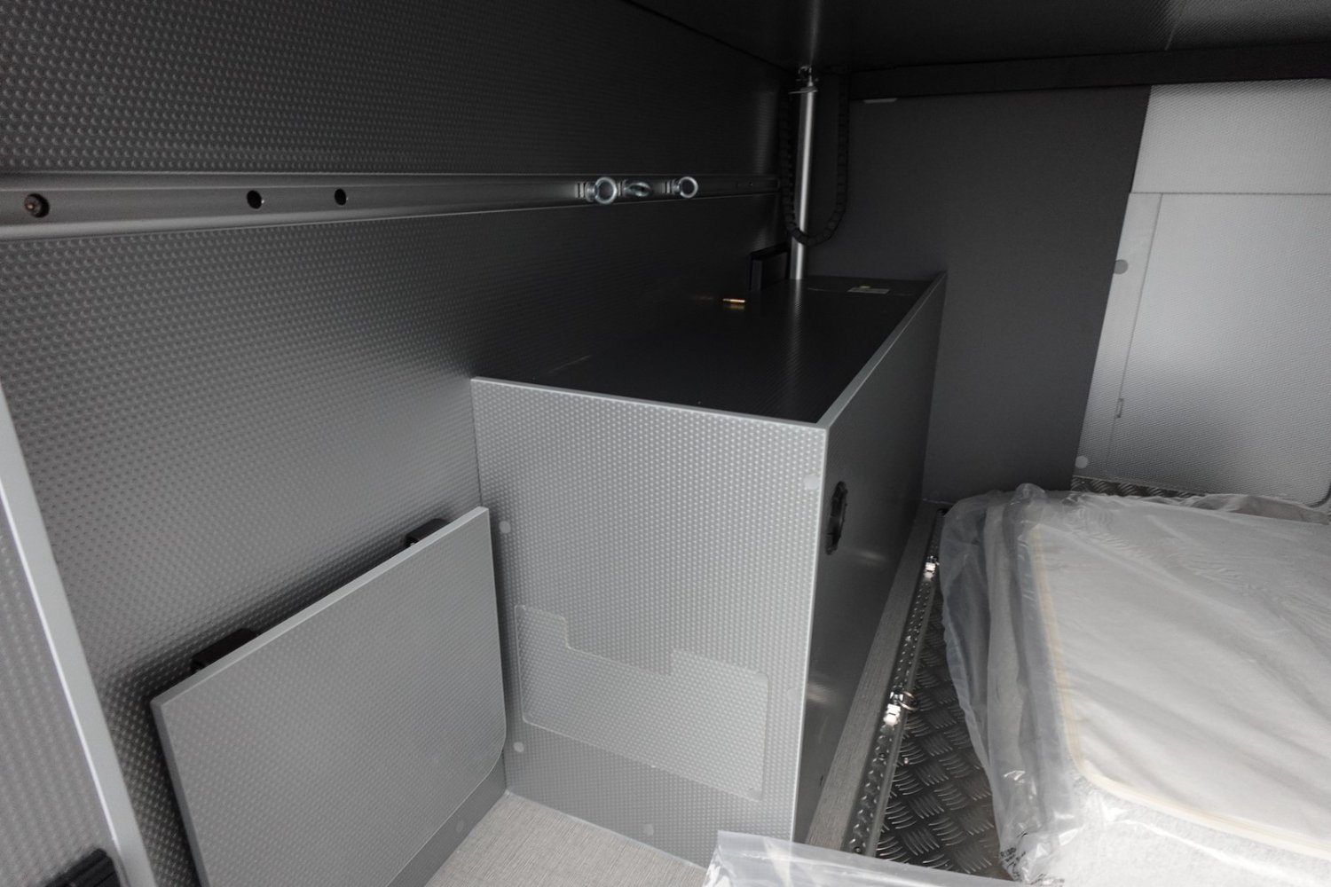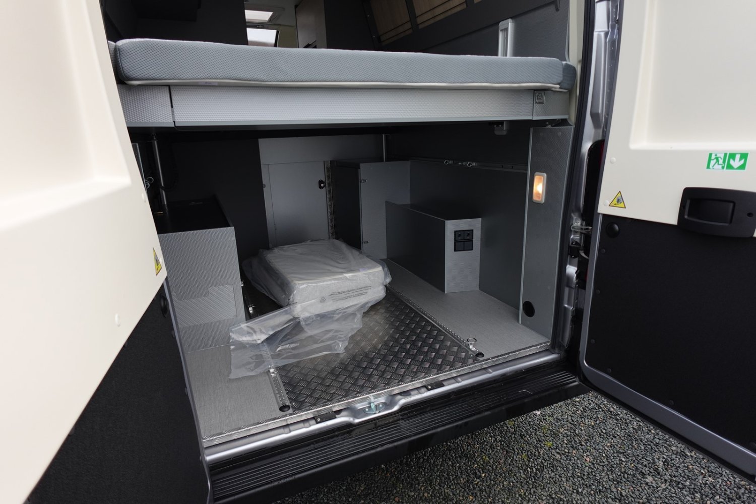 Grande soute modulable, jusqu'à 3 couchages pour partir entre amis ou en famille dont un couchage arrière relevable électriquement, nombreux rangements répartis dans le véhicule, salle d'eau DUO'SPACE avec paroi pivotante.