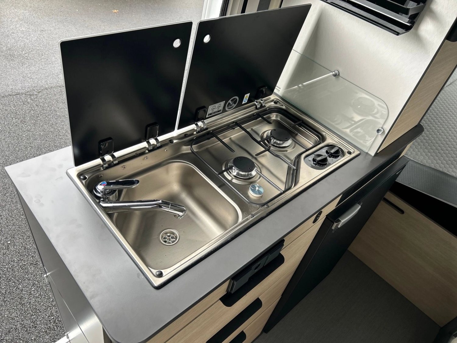 - Évier inox lisse avec couvercle en verre noir brillant et robinet rabattable