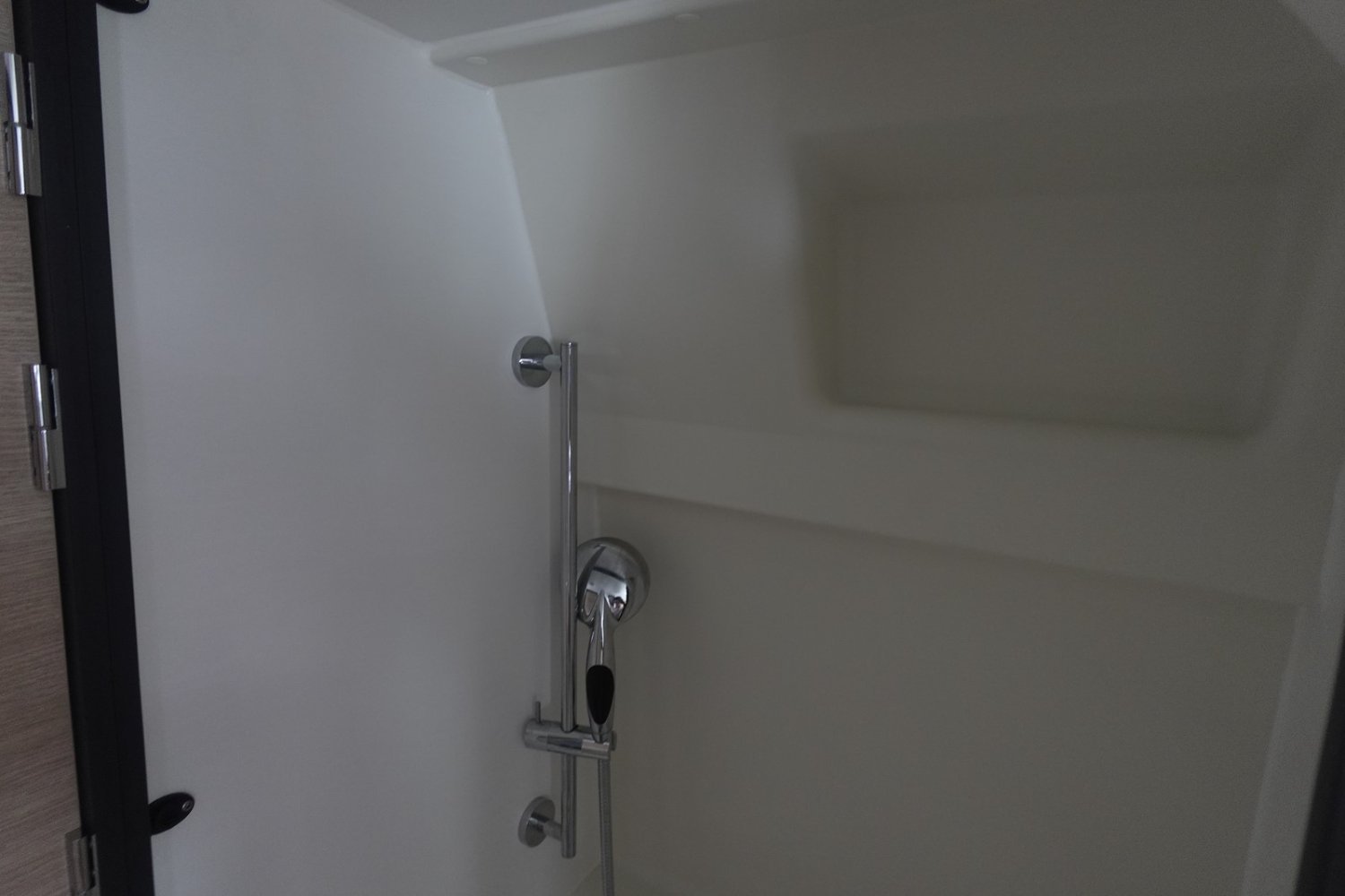 Fourgon aménagé comprenant un salon avant panoramique, un grand réfrigérateur, une douche indépendante de l’espace WC/lavabo, une cuisine avec de nombreux rangements et un lit arrière transversal.