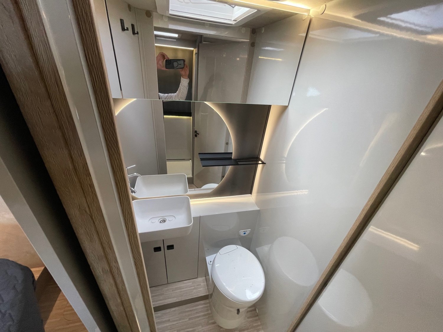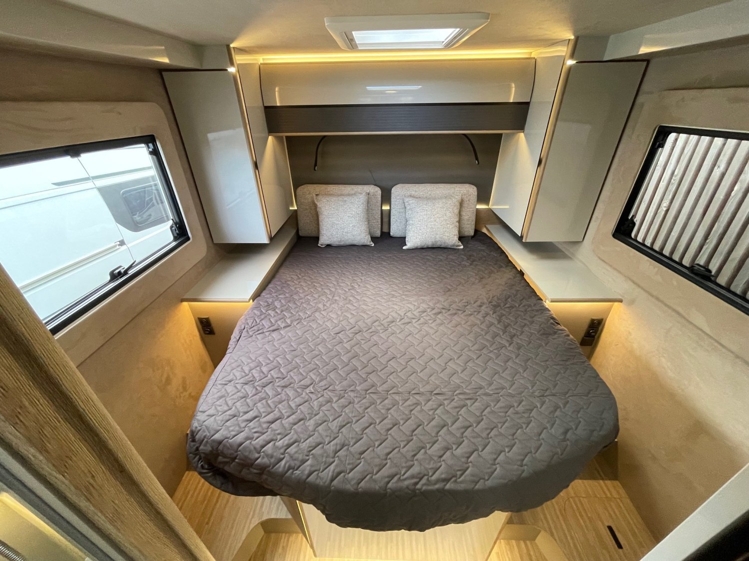 Ce camping-car a été conçu pour offrir un confort maximal, avec un espace nuit comprenant deux grands lits jumeaux placés au-dessus d’un garage très spacieux.