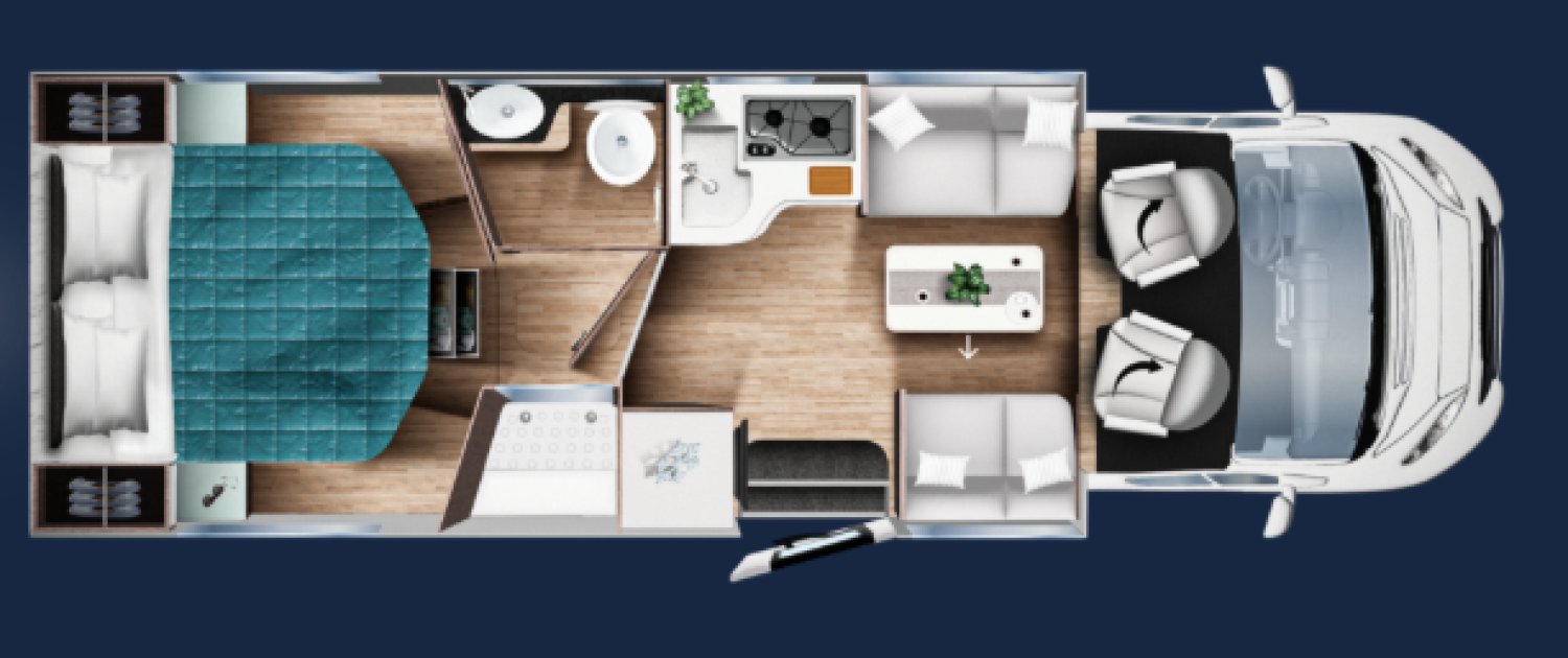 Lit central confortable, salon face-face convivial, cuisine équipée, salle d’eau avec douche indépendante : tout est réuni pour profiter de la route avec le confort d’un vrai petit chez-soi.
