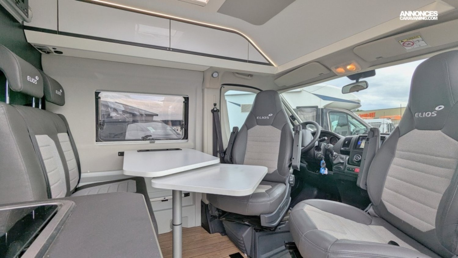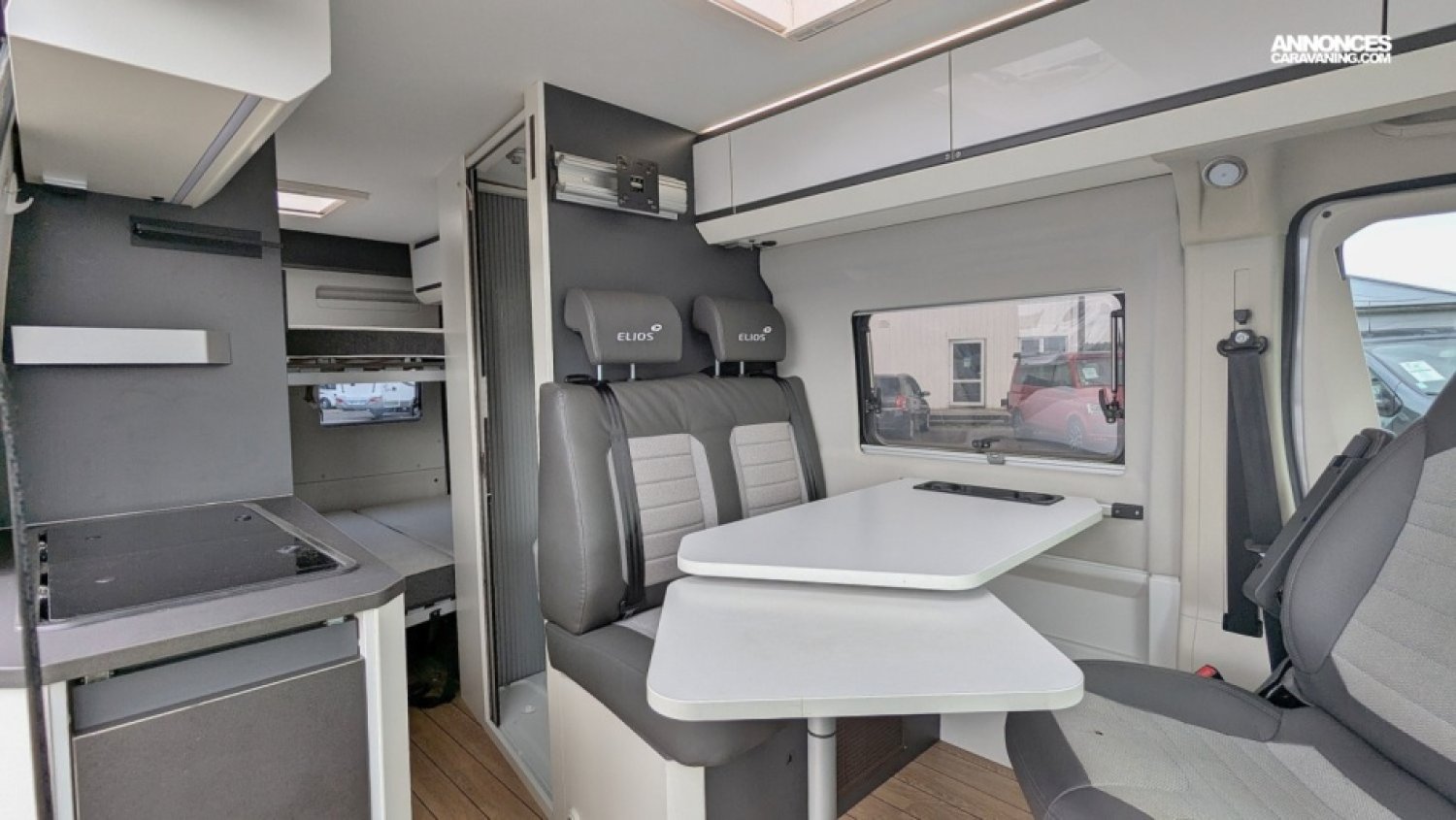 Fourgon, salon avant avec sièges pivotants, très belle cuisine, réfrigérateur, douche séparée, lit transversal, couchettes superposees, nombreuses options