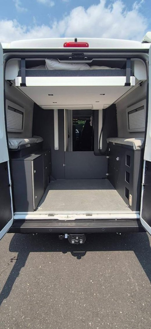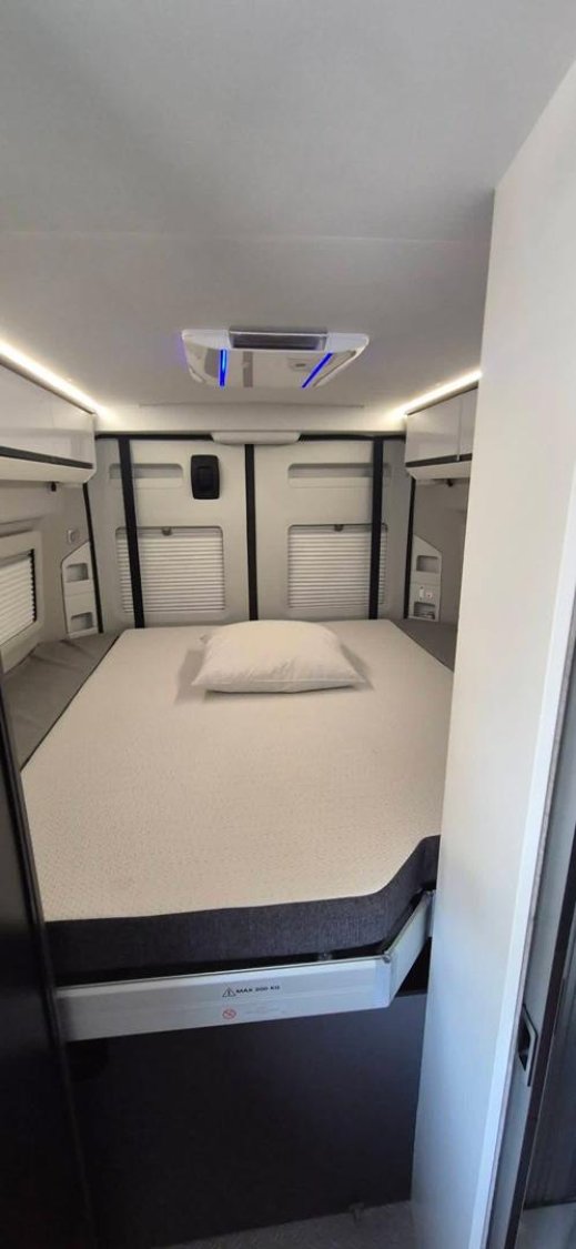 Le véhicule dispose d’un lit transversal arrière électrique pour deux adultes, réglable en hauteur, permettant de créer une grande soute en dessous pouvant accueillir plusieurs vélos ou une moto.