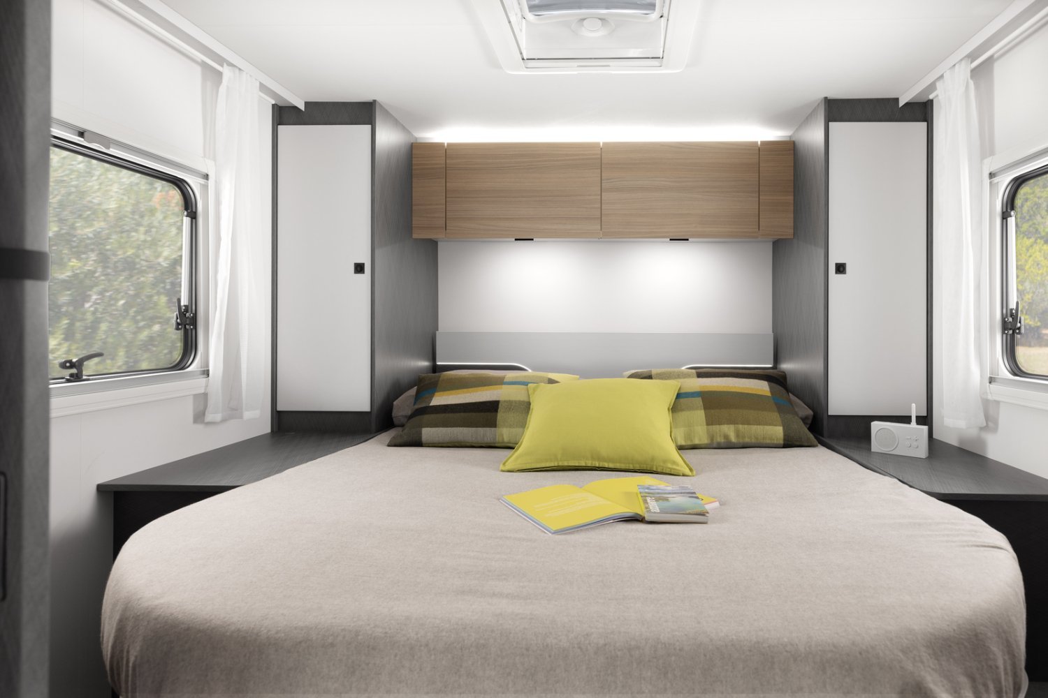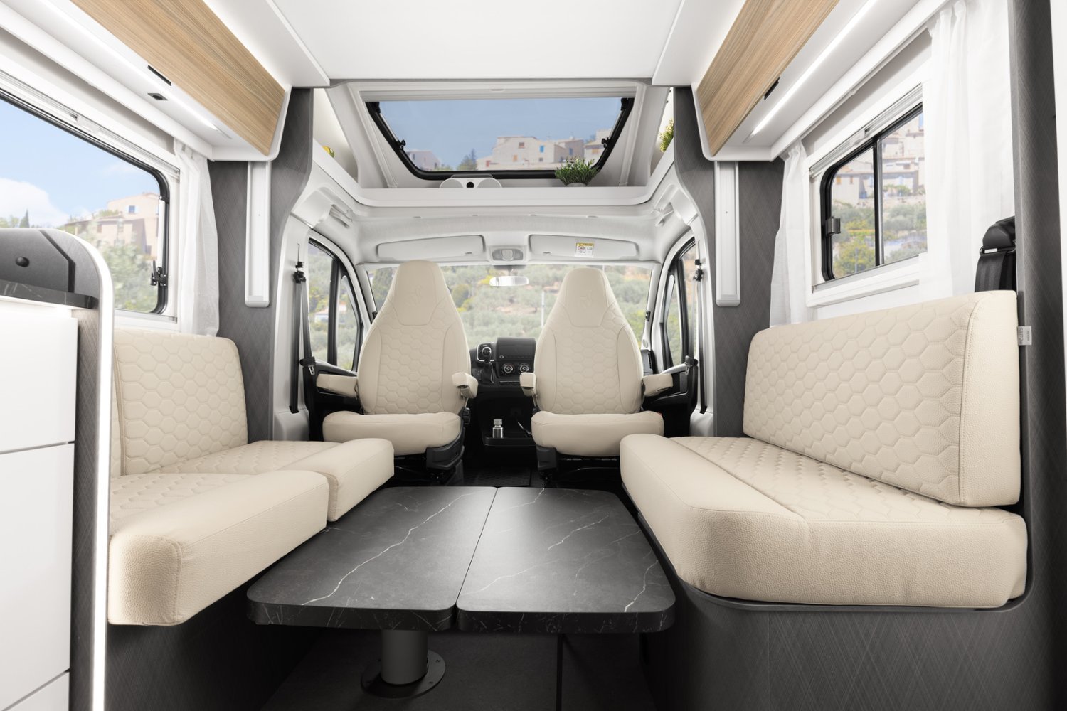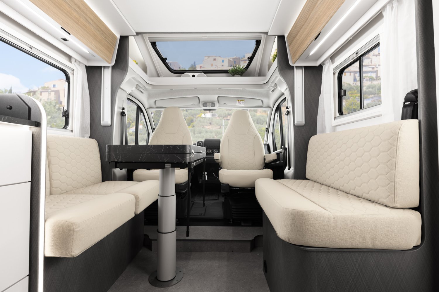 Idéal pour les voyages longue durée en couple ou en famille, ce modèle se distingue par son lit central, sa grande salle d’eau avec douche séparée et son salon face à face spacieux et lumineux.