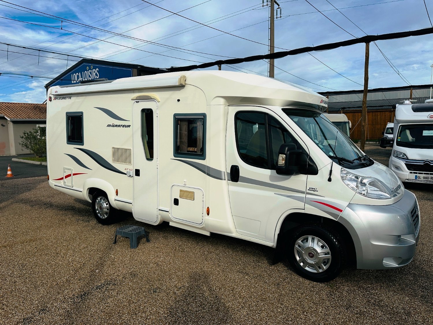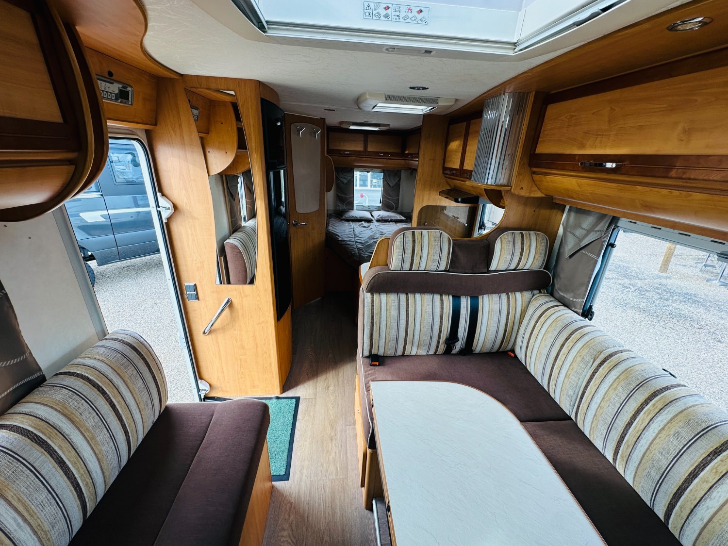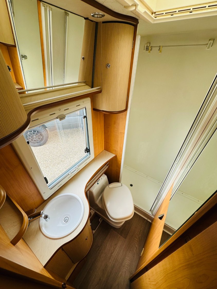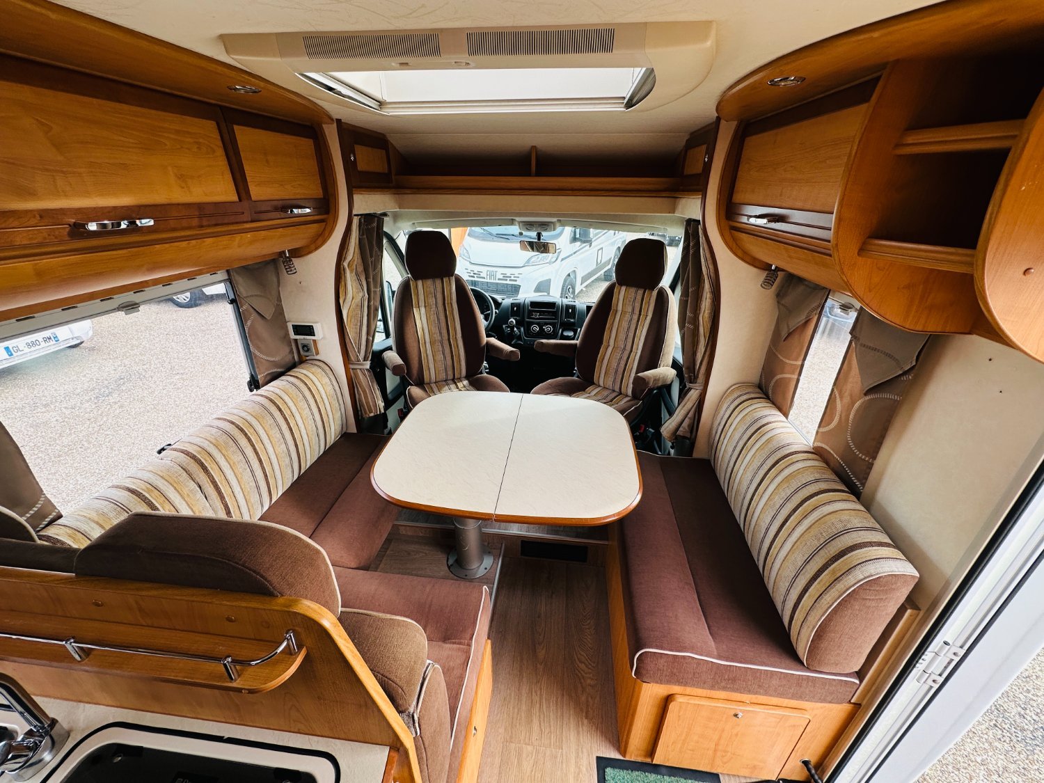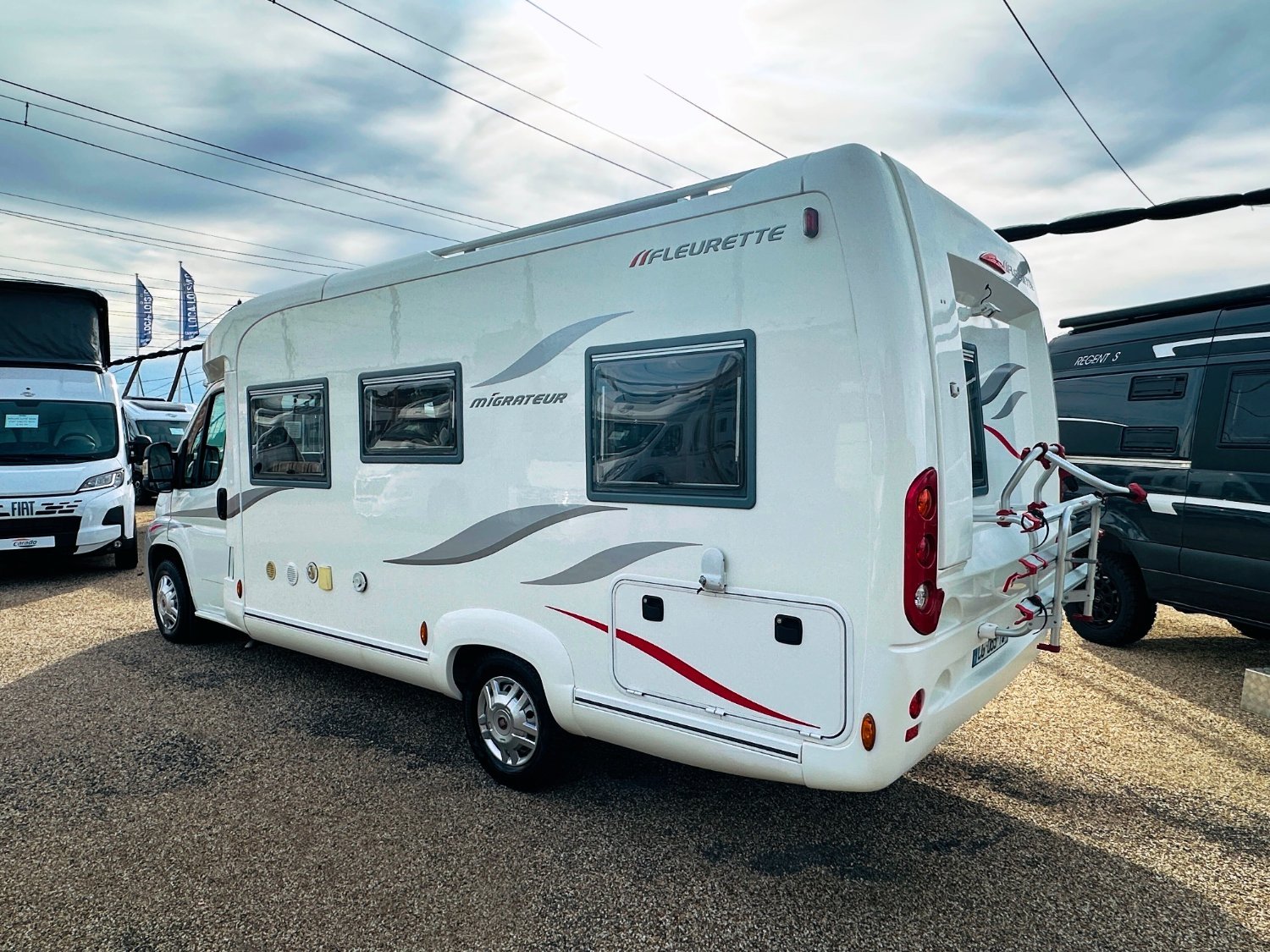 Profilé Fleurette, fabrication Française recherchée, lit à la Française, 4 couchages, salle de bain avec douche séparée, cuisine en L équipée d’un grand frigo automatique, vaste salon avant avec banquette latérale et sièges cabines pivotants convertible en un couchage double d’appoint.