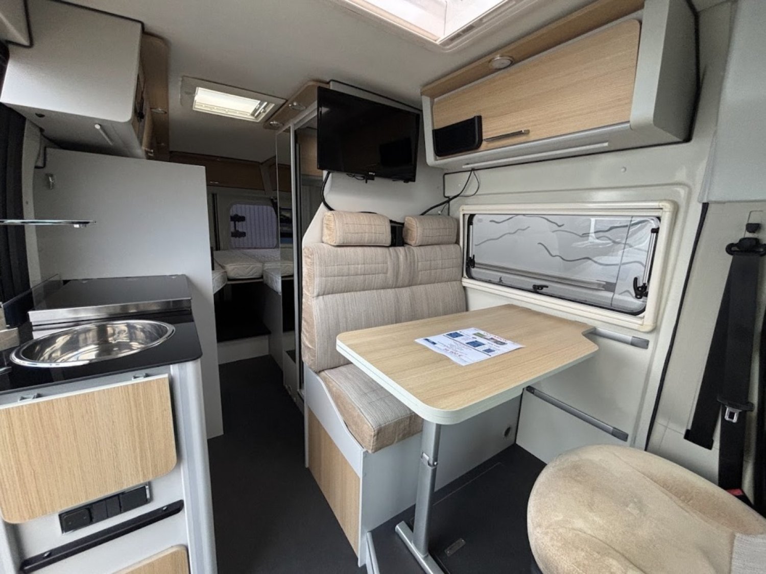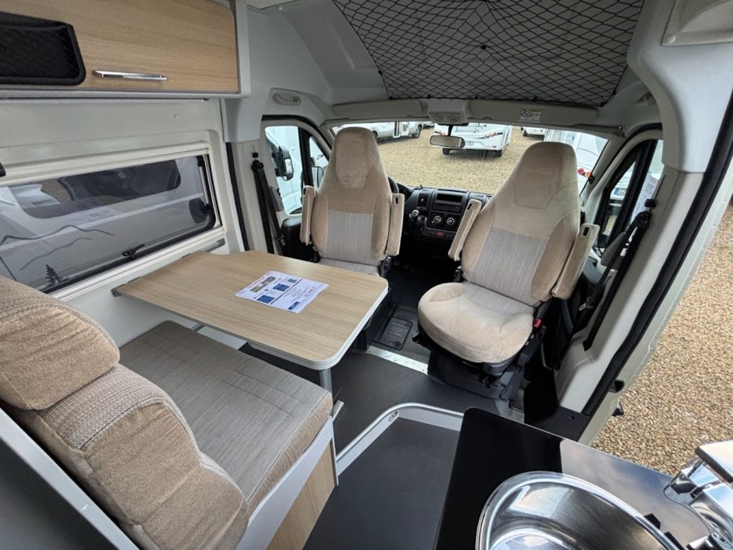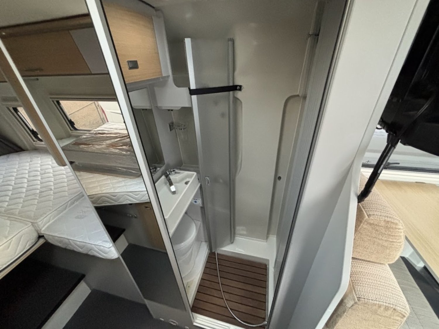 Cuisine en long, Douche à vario, Lit dînette avant, lit jumeaux, Salon avant sièges pivotants, WC Cassette.