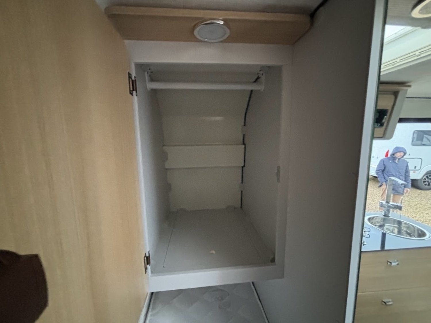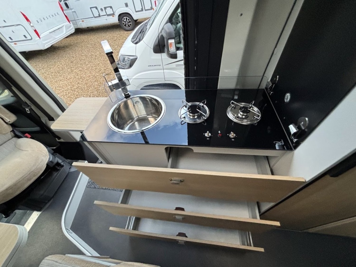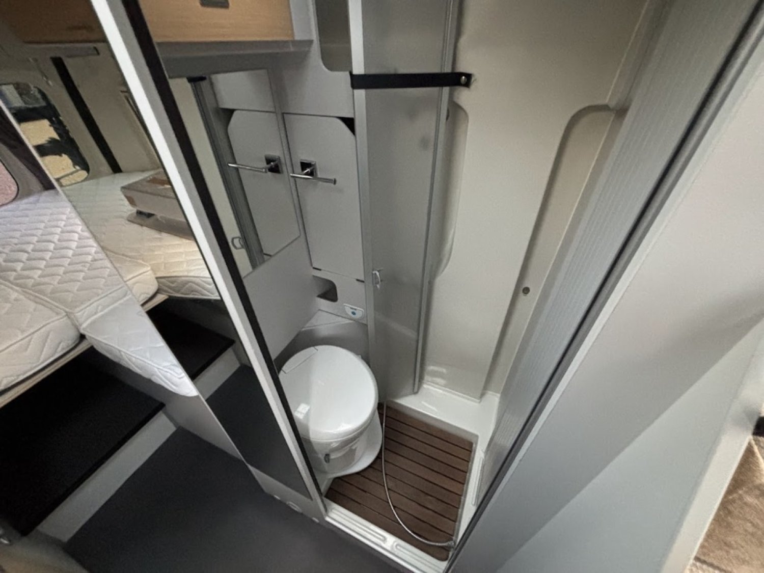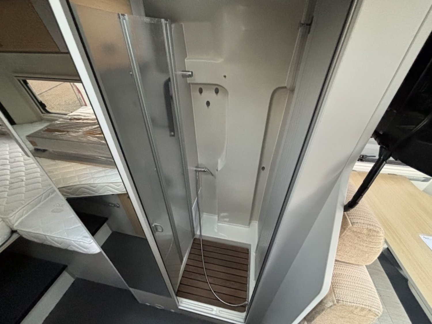 Cuisine en long, Douche à vario, Lit dînette avant, lit jumeaux, Salon avant sièges pivotants, WC Cassette.