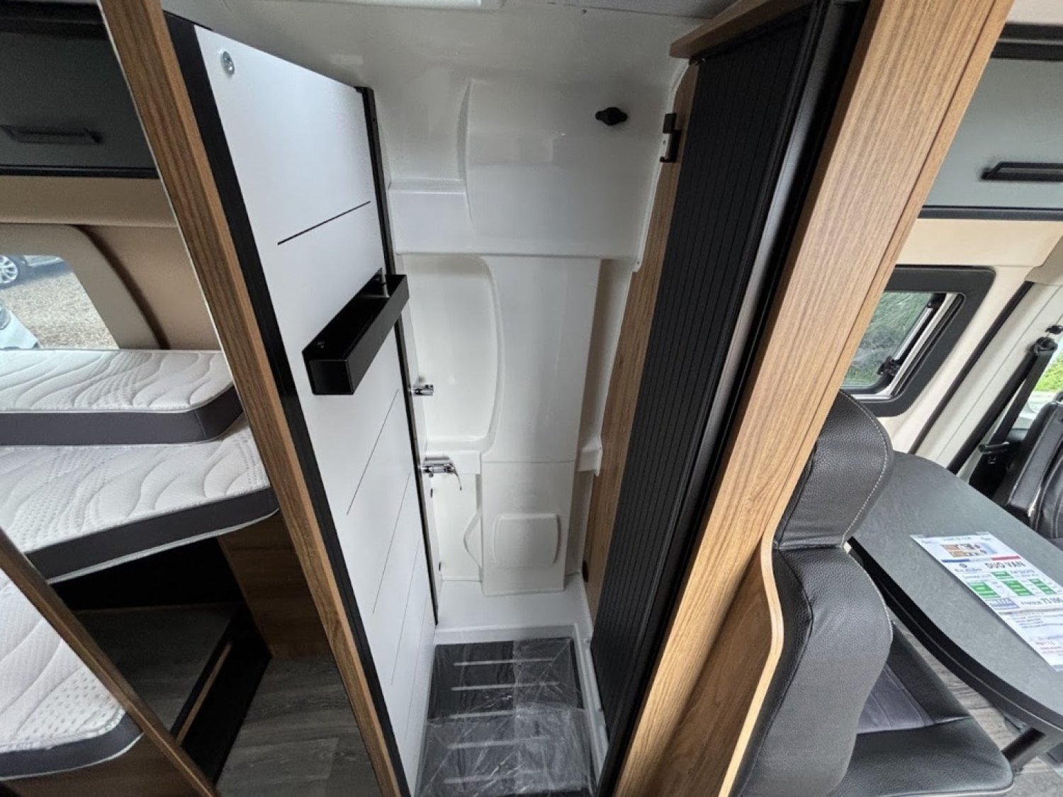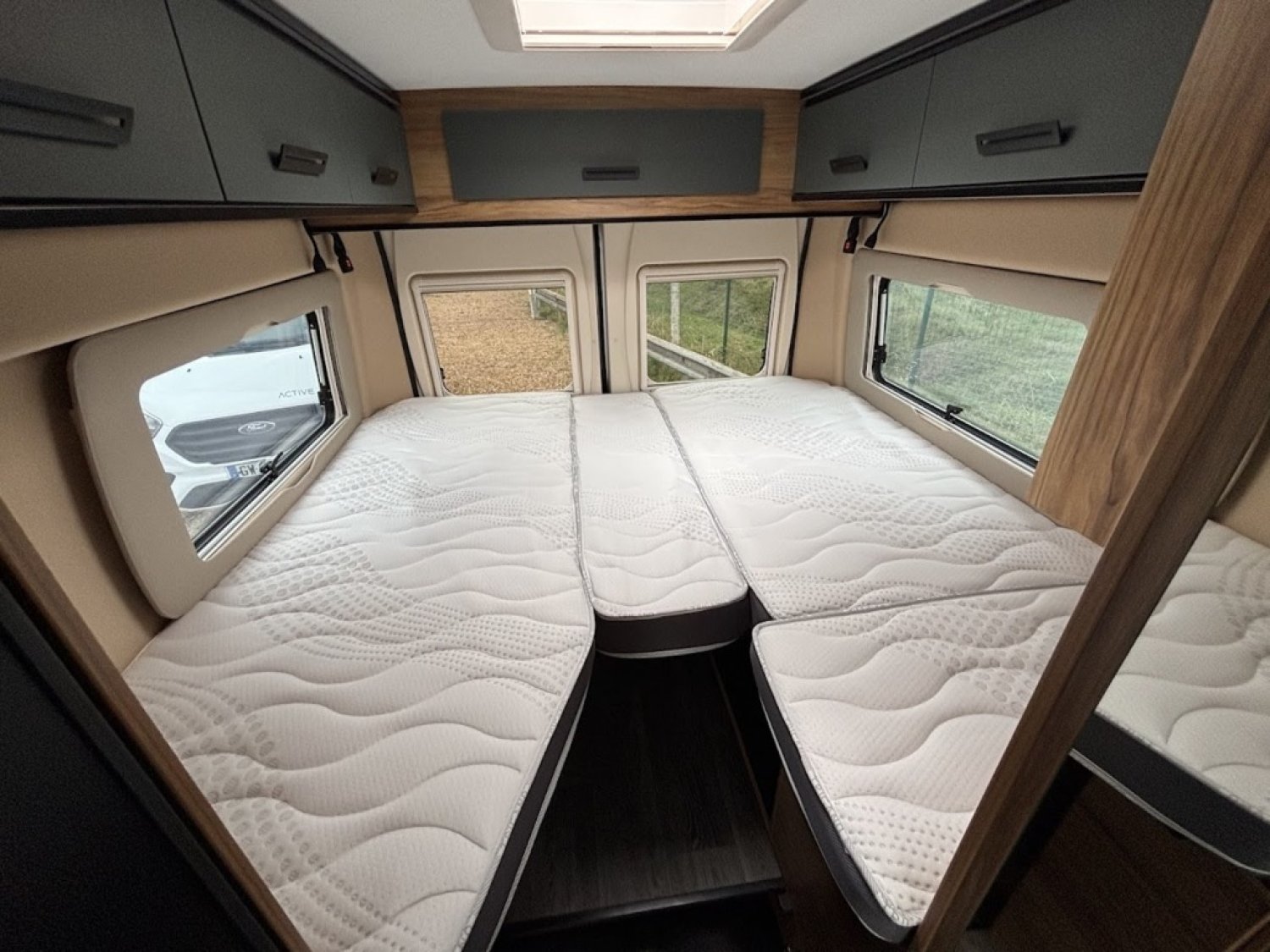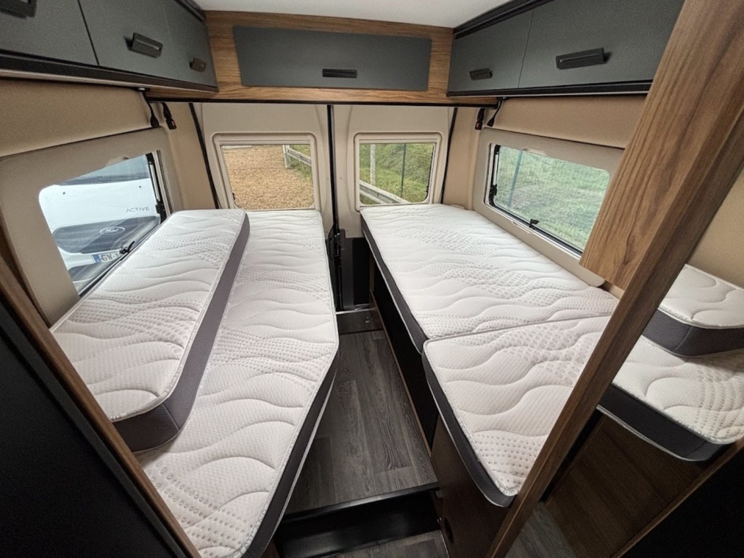 Cuisine en long, Douche modulable, Lit dînette avant, lit jumeaux, Salon avant sièges pivotants, WC Cassette.