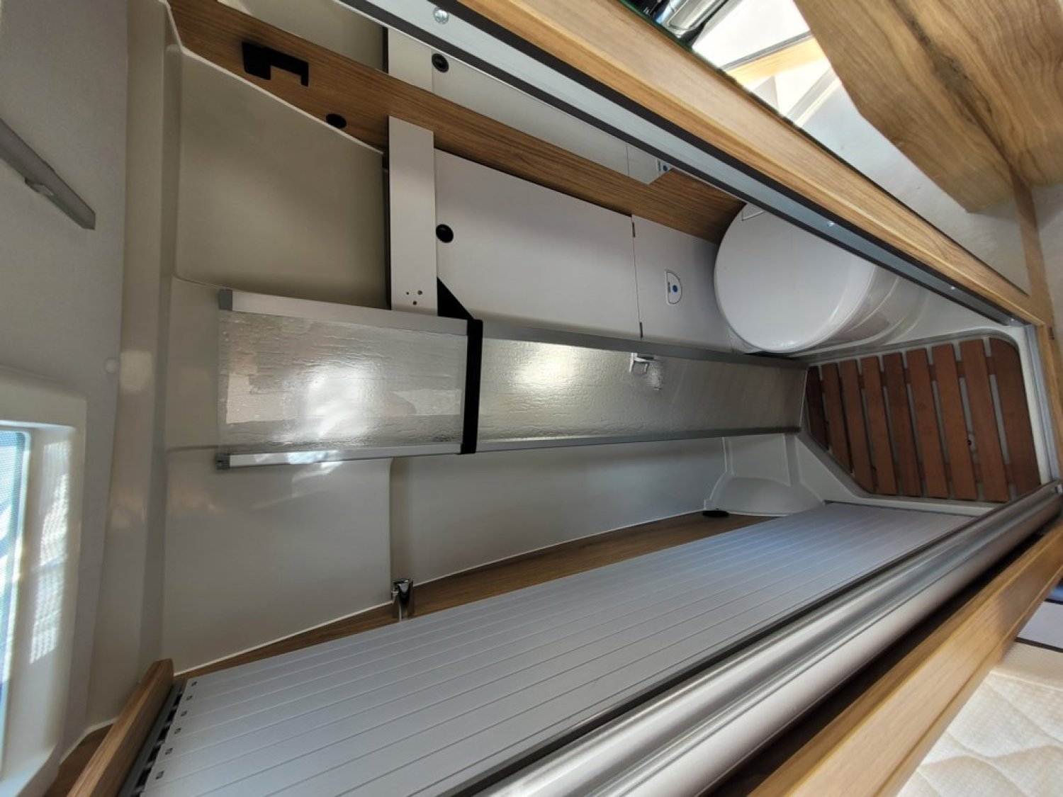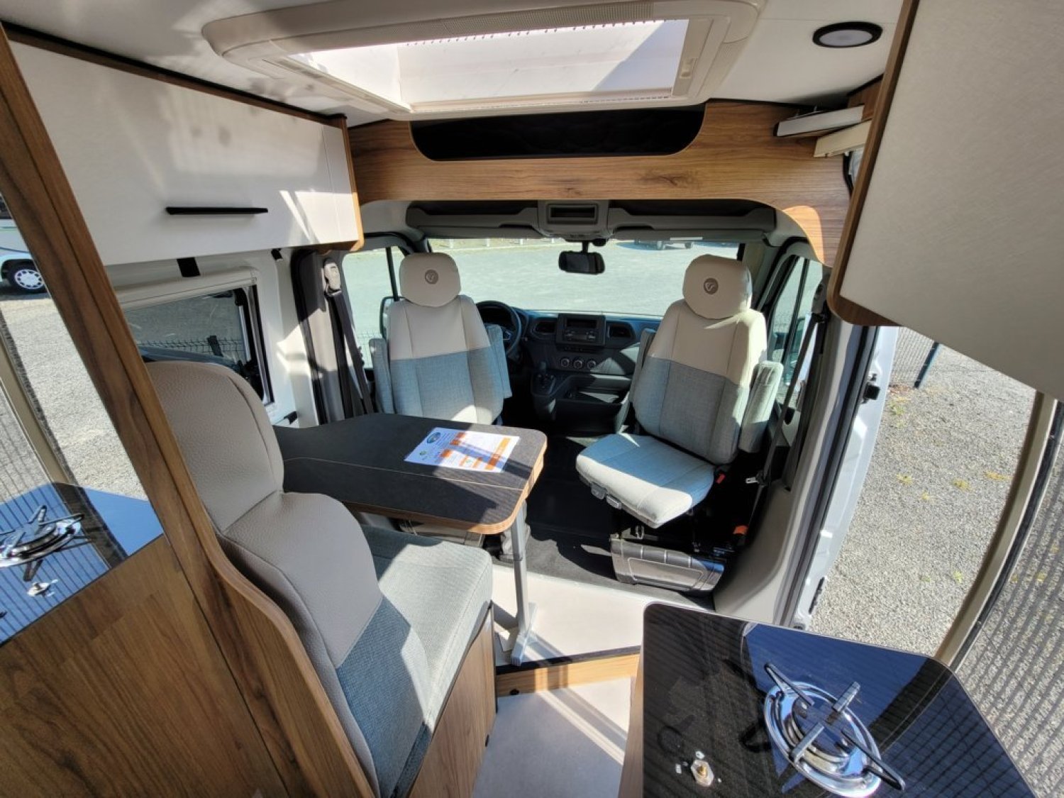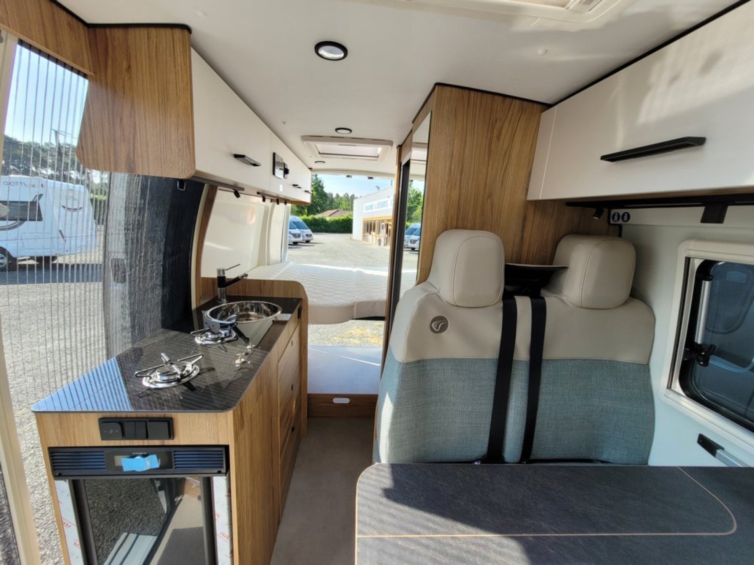Cuisine en long, Douche modulable, Lit arrière transversal, Salon avant sièges pivotants, WC Cassette.