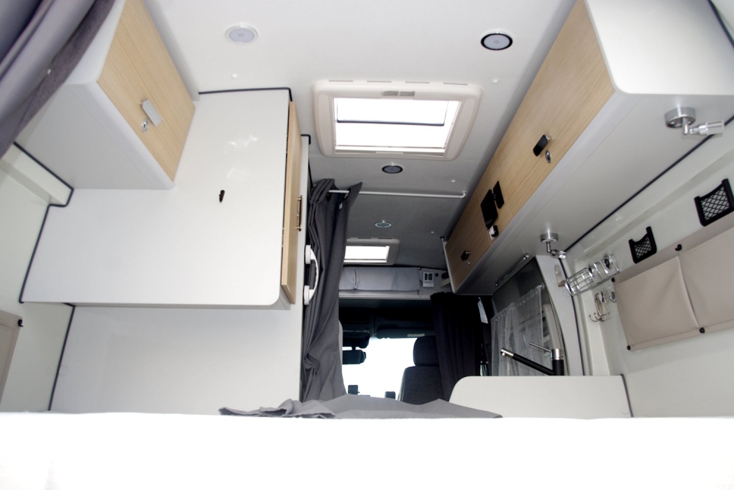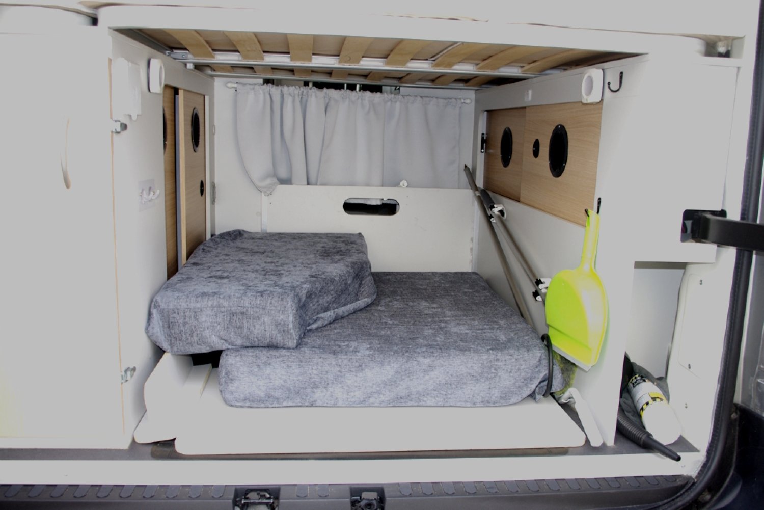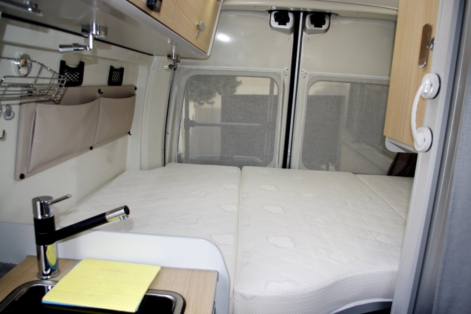 -1 couchage 2 personnes lit arrière 191 cm x136 cm avec sommier alu à lattes, literie Bultex et un couchage avant 1 personne 175 cm x 106 cm à partir de la banquette isofix arrière avec matelas Bultex,