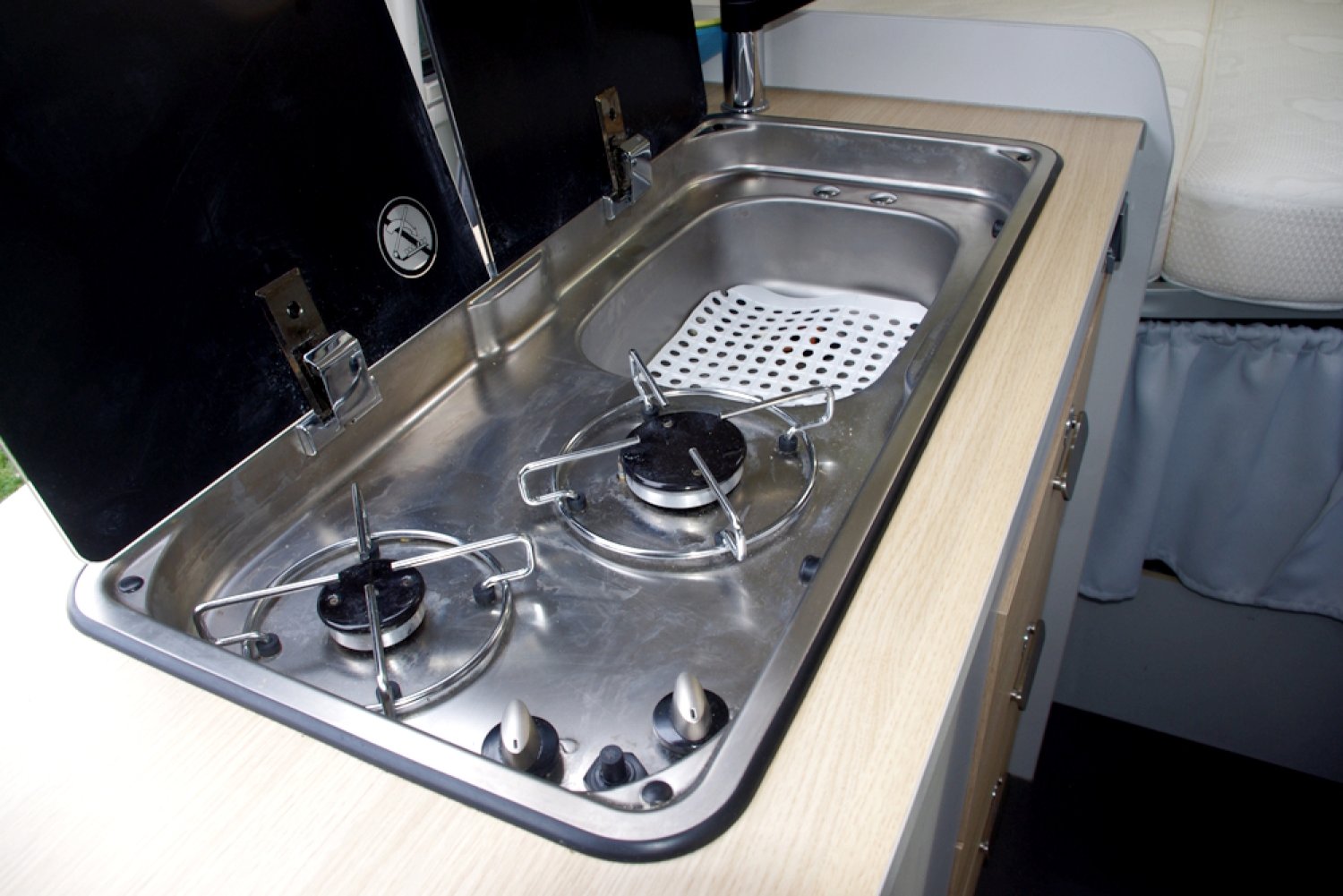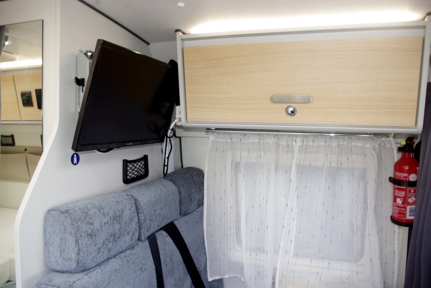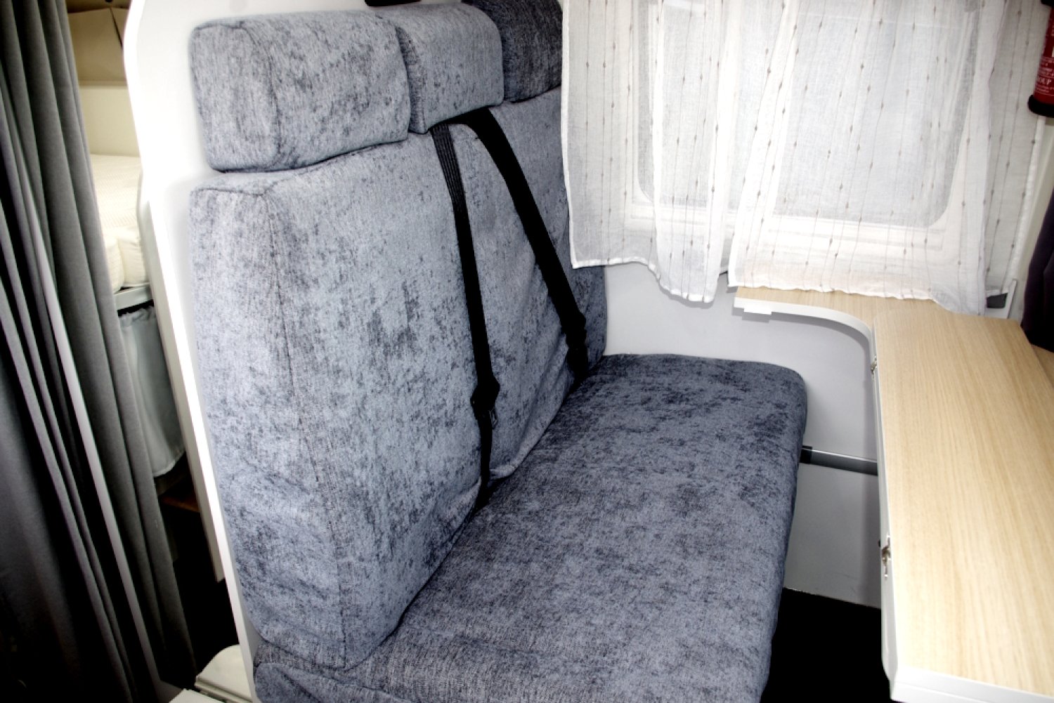 -1 couchage 2 personnes lit arrière 191 cm x136 cm avec sommier alu à lattes, literie Bultex et un couchage avant 1 personne 175 cm x 106 cm à partir de la banquette isofix arrière avec matelas Bultex,