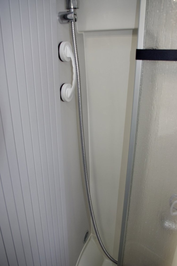 - Salle de bain, 3 en 1TB Concept, fermée par porte coulissante, avec douche, lavabo, rangements et WC entretien par cassette extractible 18 litres à l’extérieur,