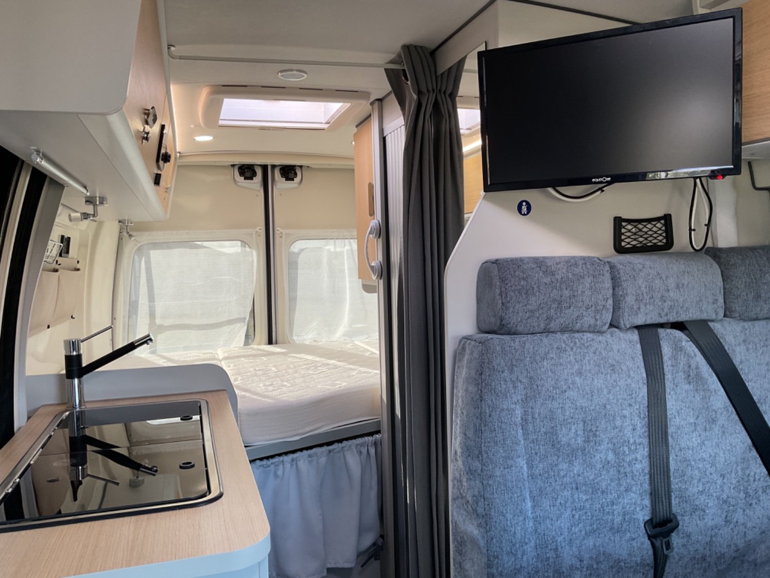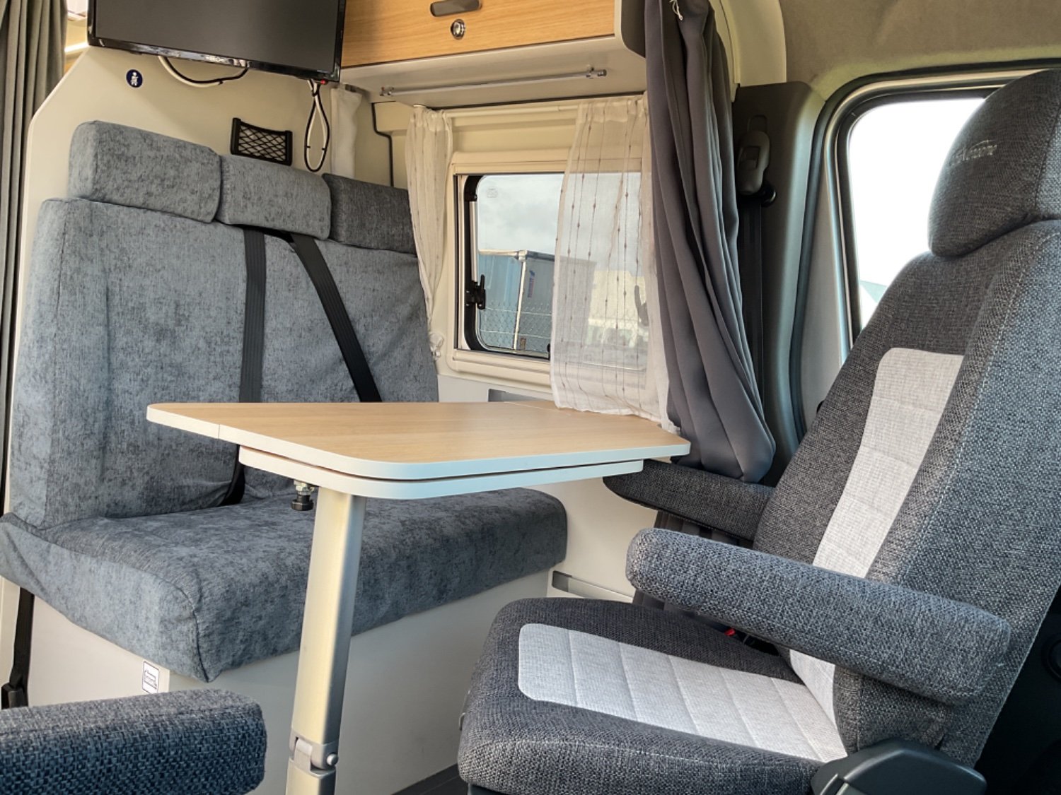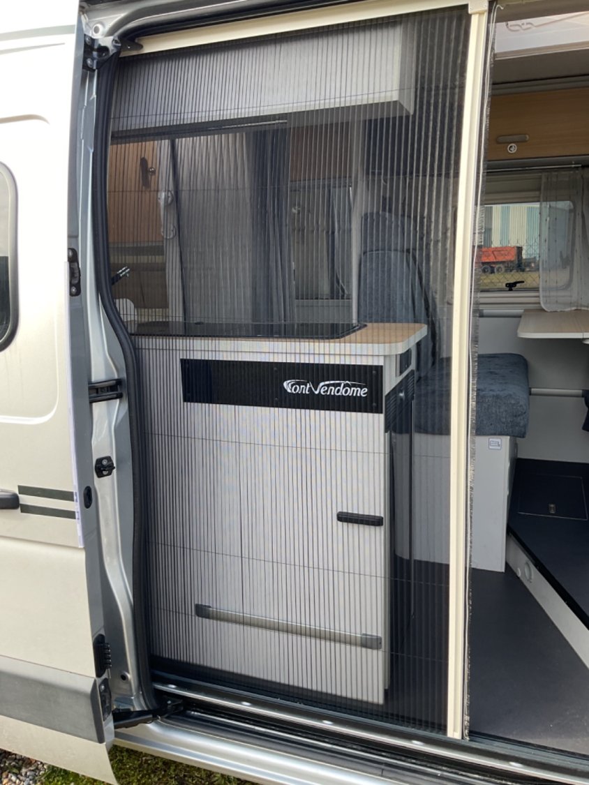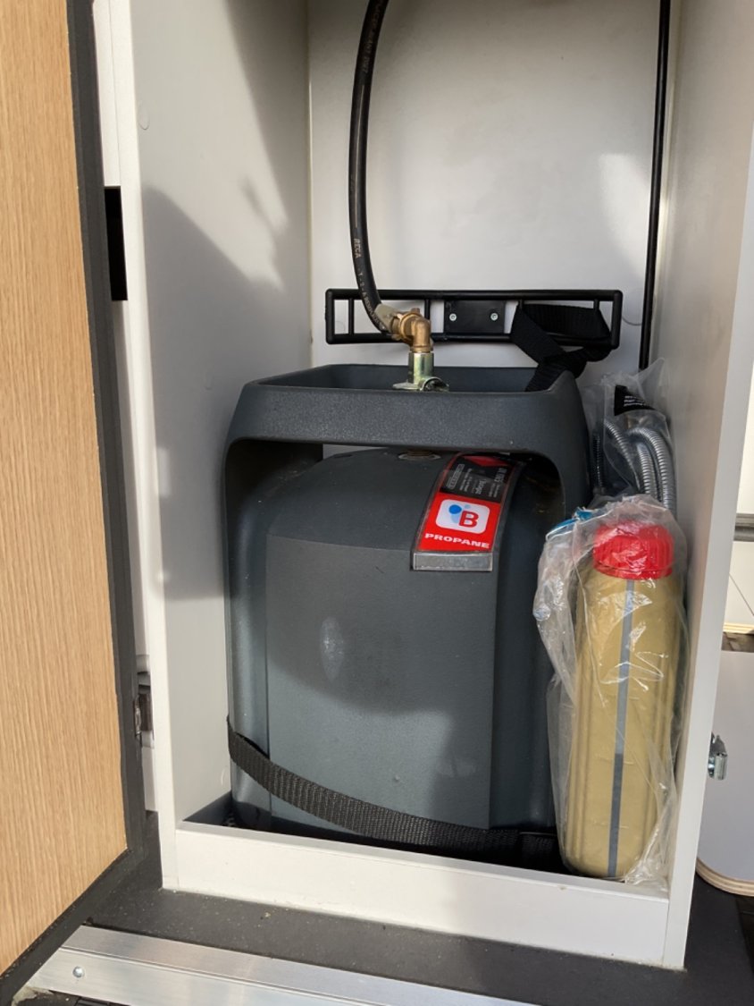 CELLULE: Frigo+freezer à compression 70l., Lanterneaux, Foyers Cuisson(2) gaz, Marche-pied élec., Batterie Lithium 100W, Combiné 4 Truma Chauffage + Chauffe-eau Gasoil, Salle de bain modulable, Sièges AVD/AVG pivotants, Moustiquaire de porte, Télévision écran plat, 1 Bttle de gaz Propane 13Kg.