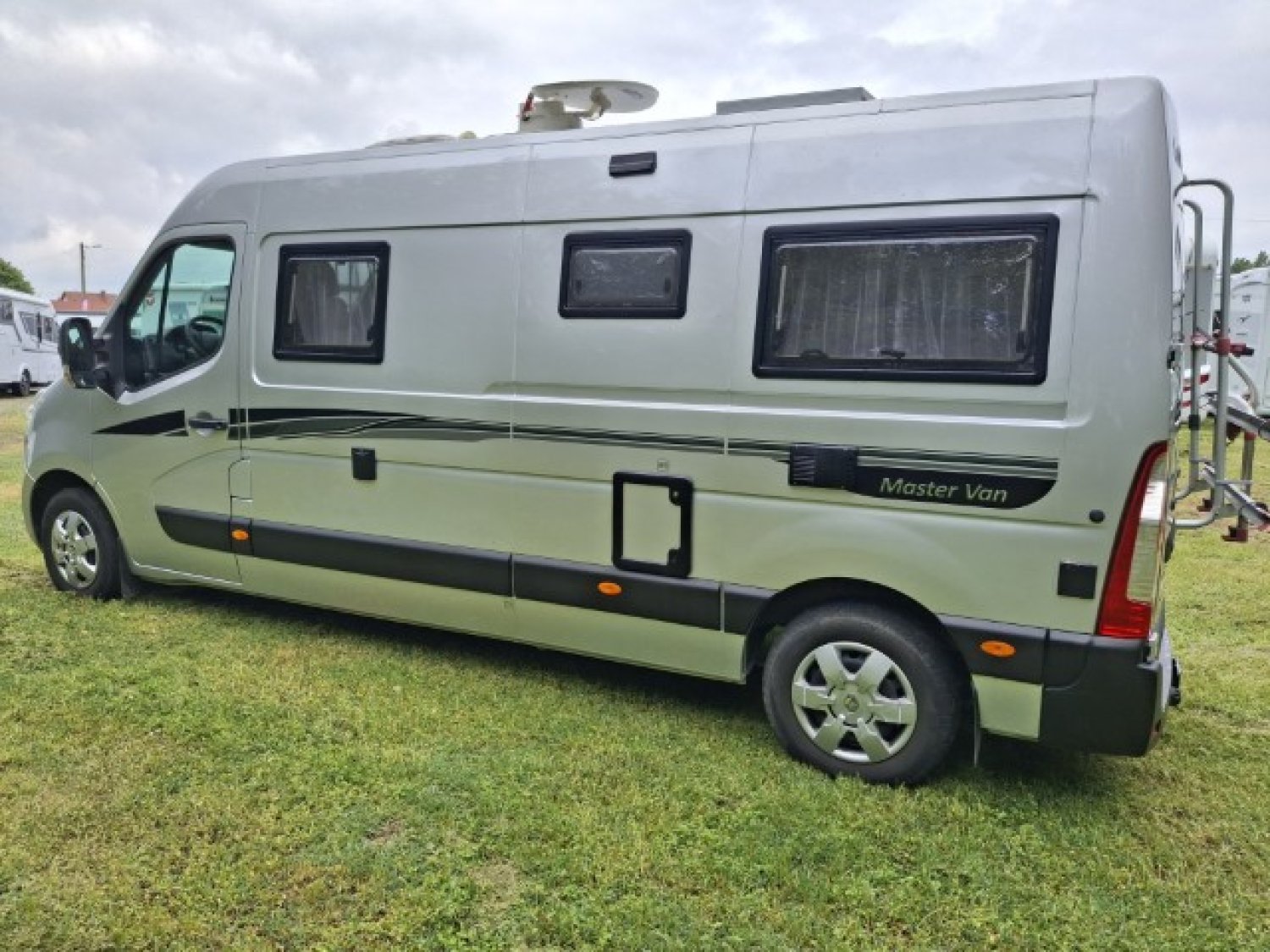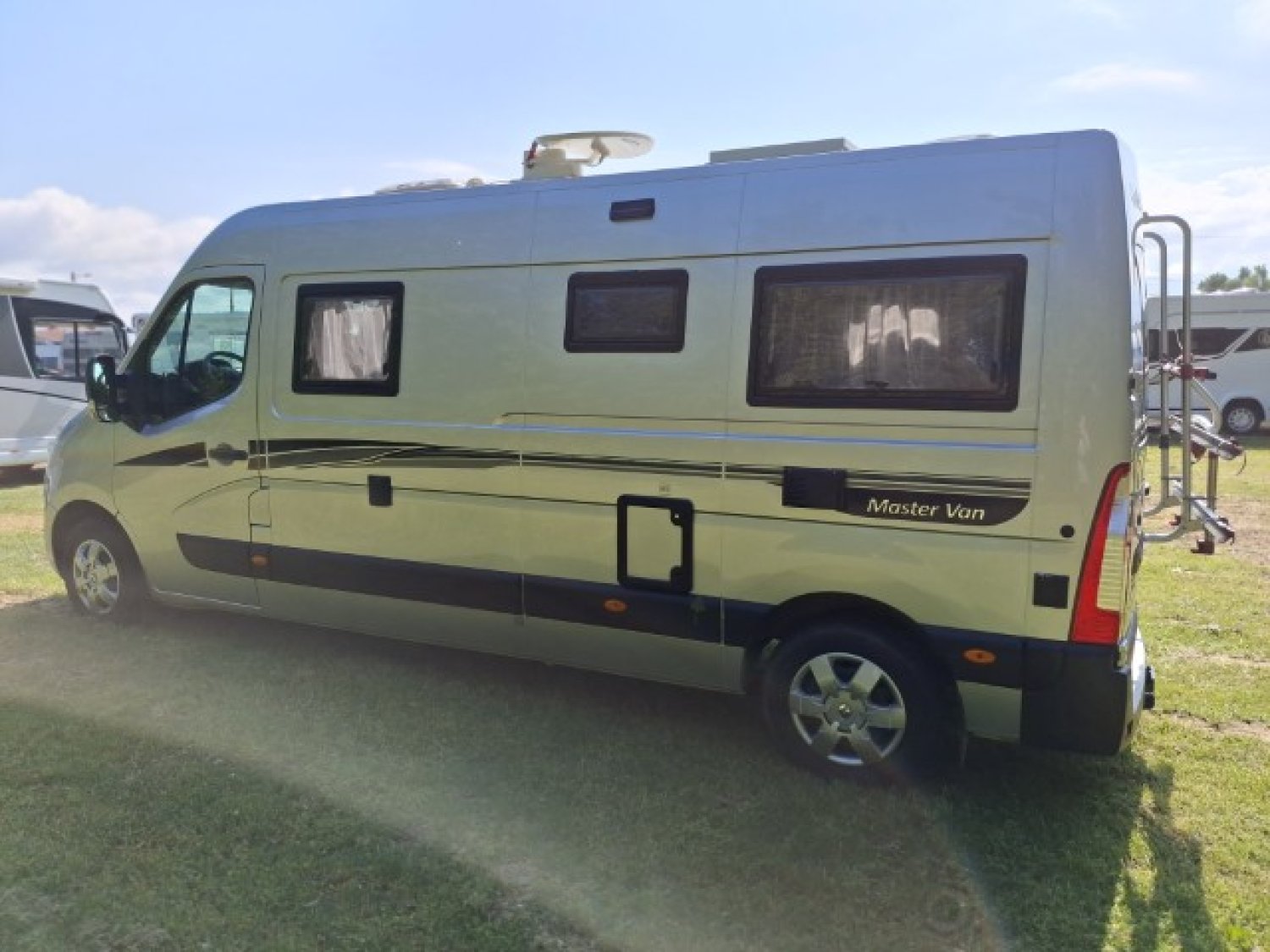 Antenne satellite auto + TV, Store, Panneau solaire 100 W, Attelage, Porte 2 vélos