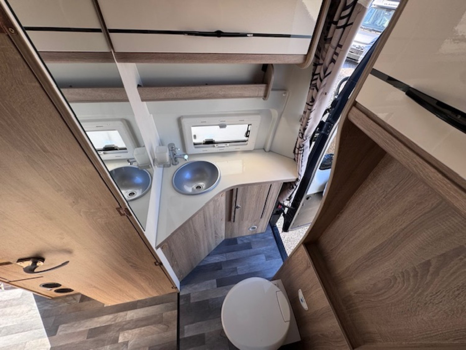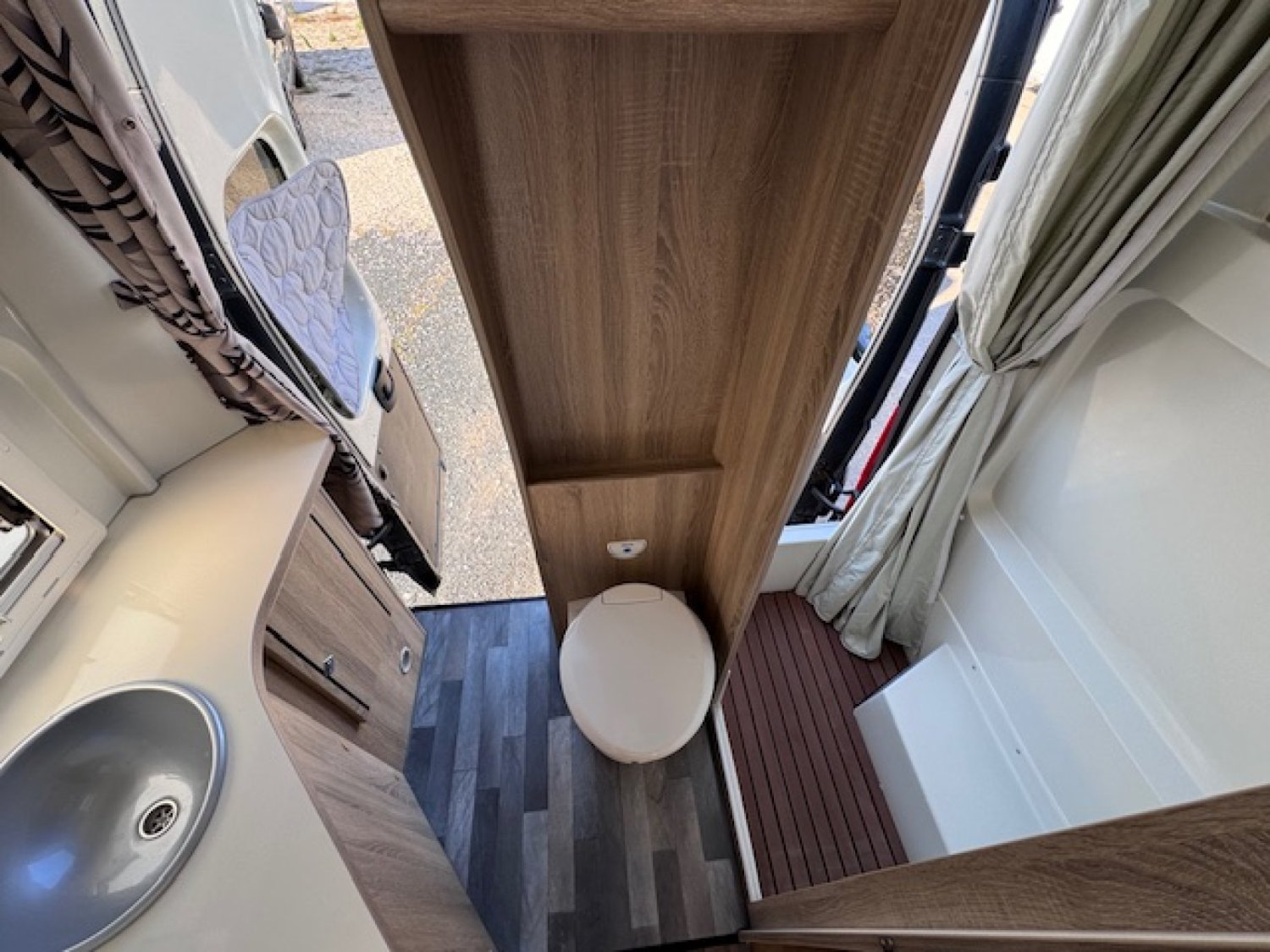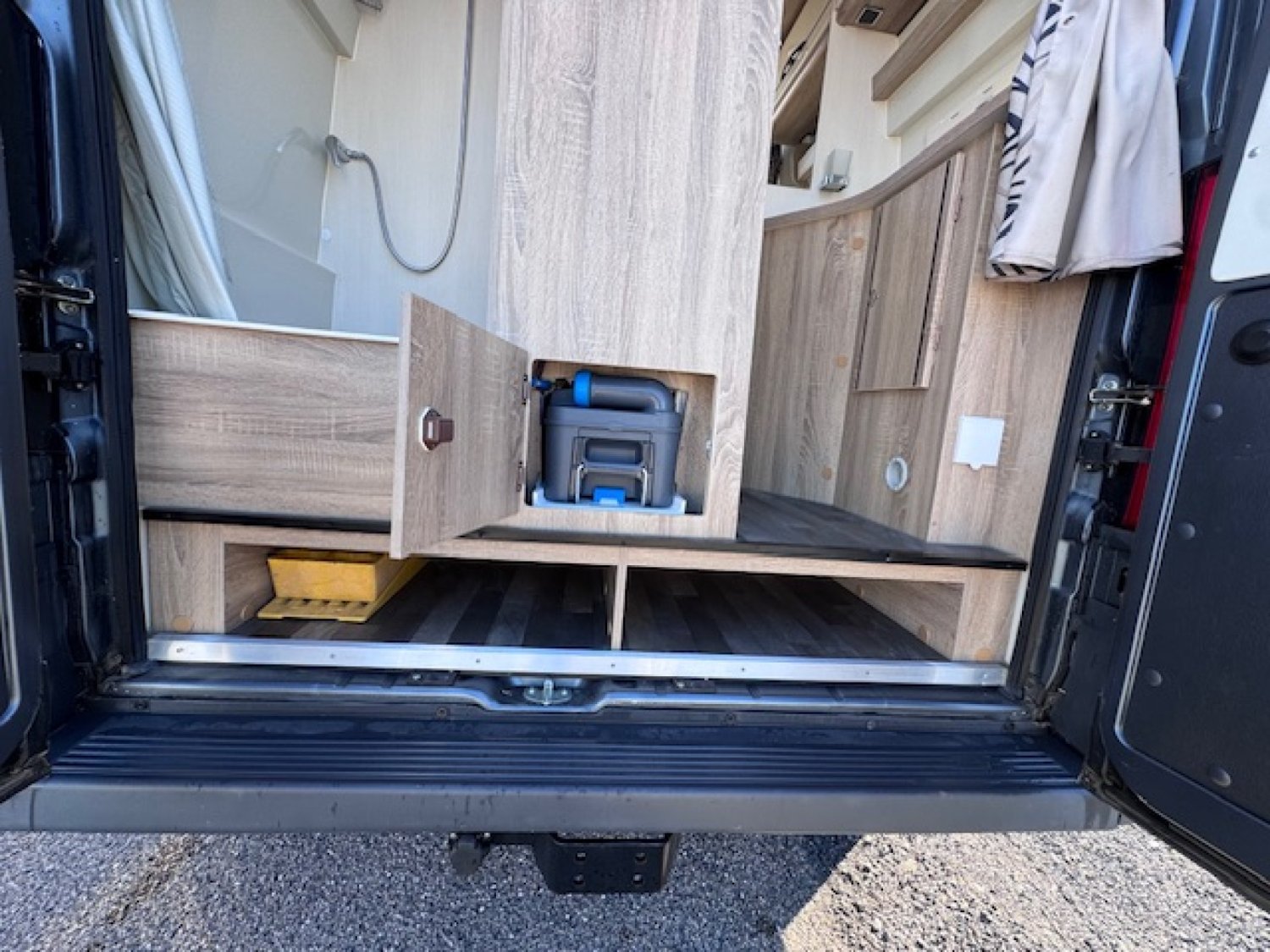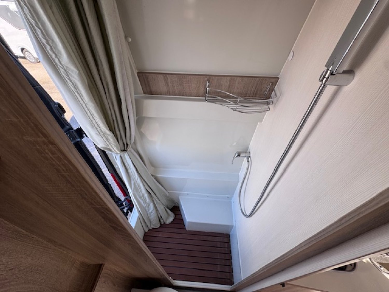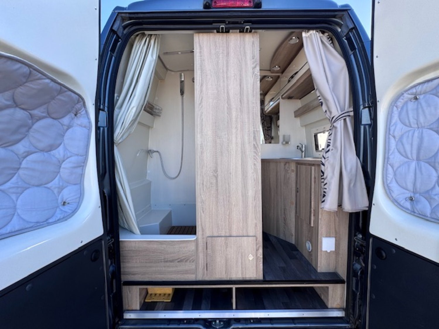A l'arrière, le fourgon est également constitué d une salle de bain équipée d'une douche séparée du lavabo et du WC.