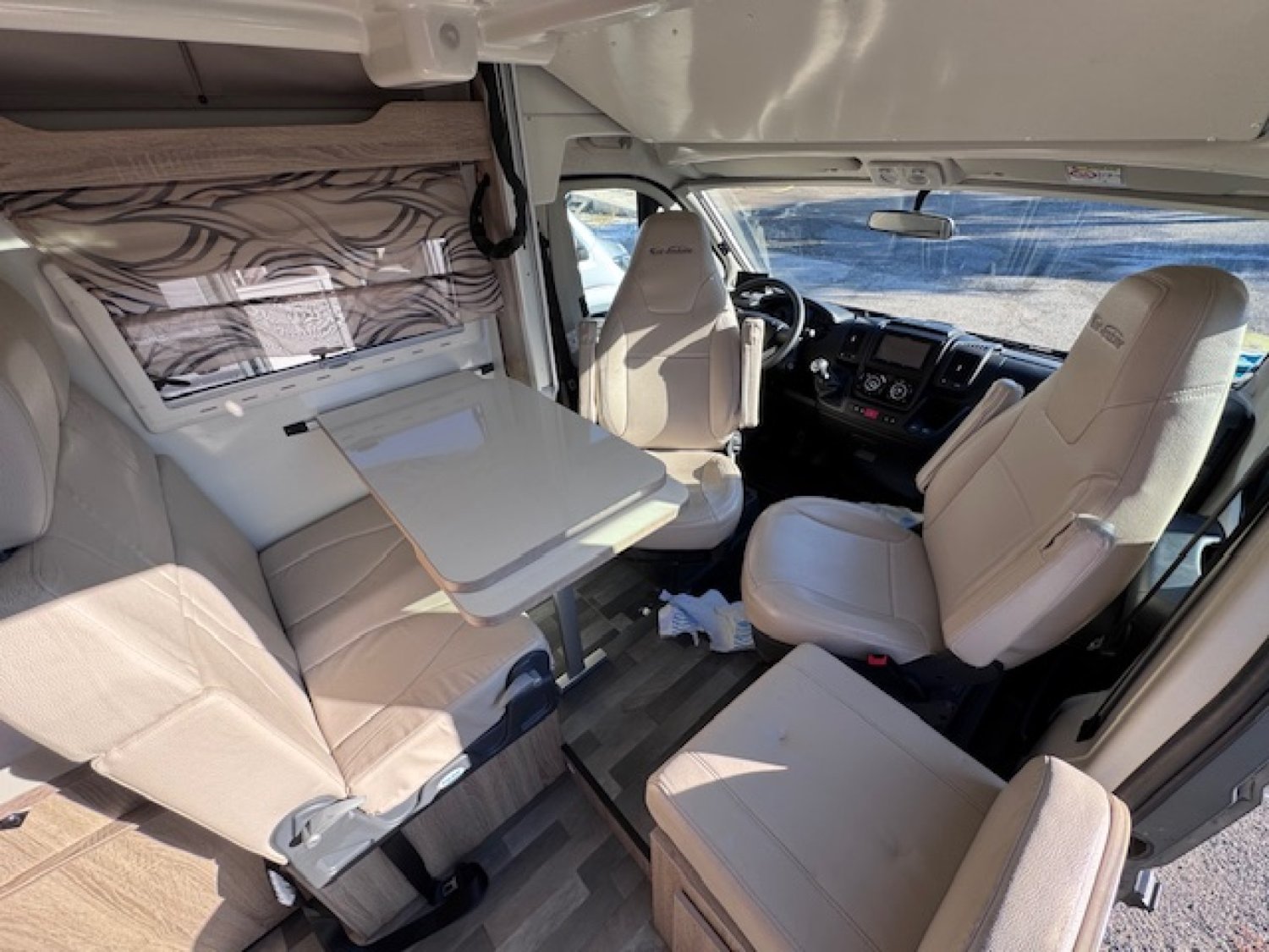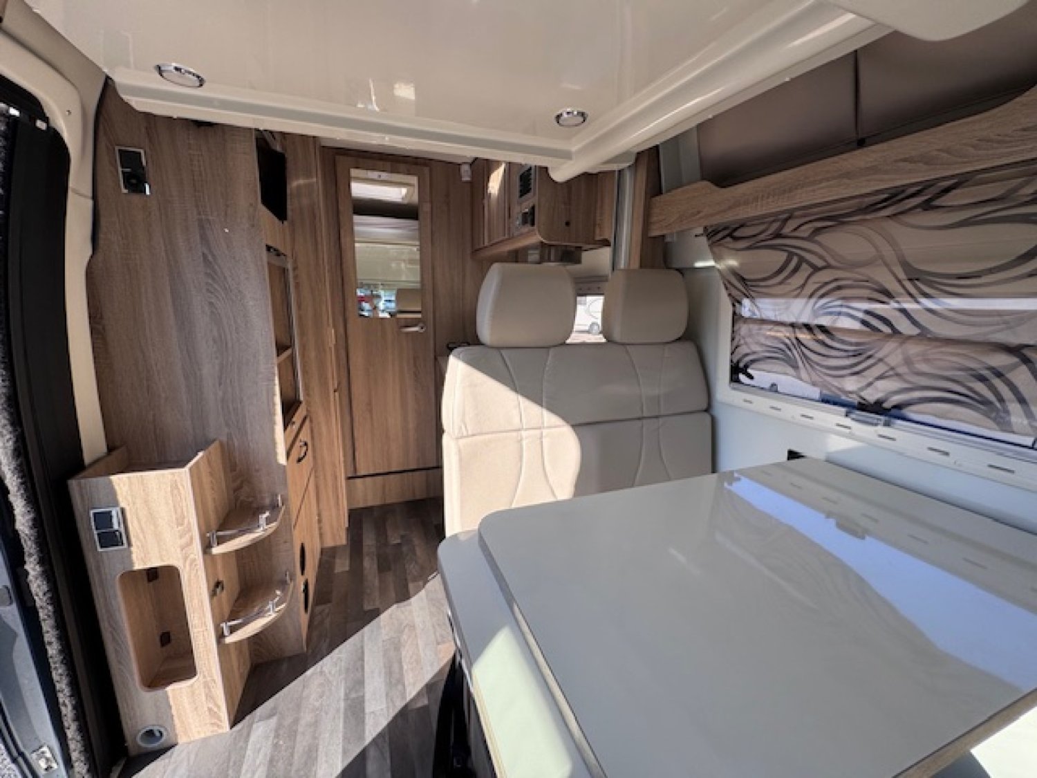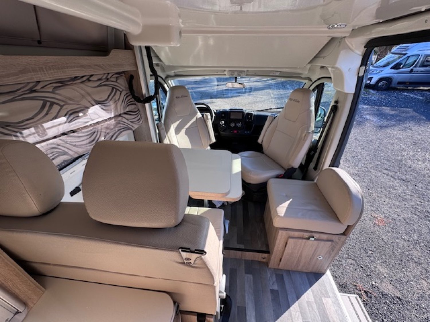 A l avant du véhicule, vous y retrouverez un salon spacieux pouvant accueillir jusqu'à 5 personnes avec des sièges pivotants, idéal pour les repas et autres moments conviviaux.